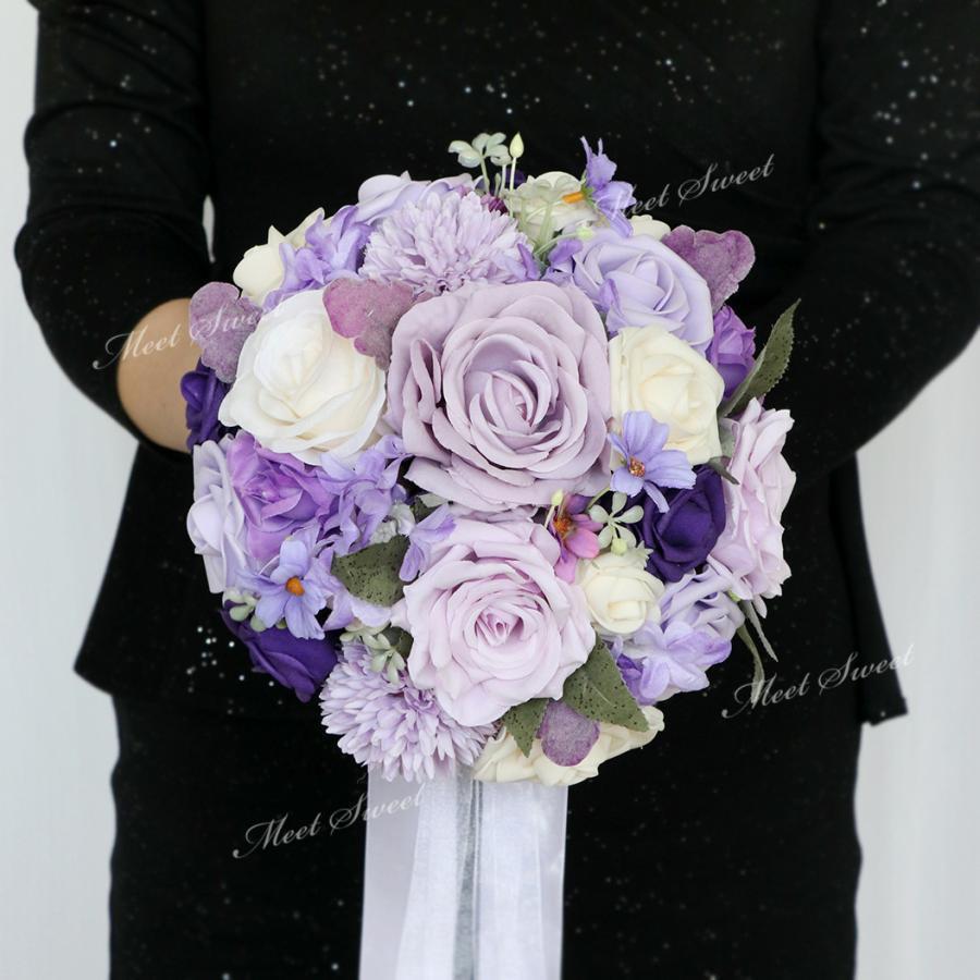ウェディングブーケ ブライダルブーケ ラウンドブーケ ウエディングブーケ 花嫁 ブーケ 造花 花束 可愛い 結婚式 二次会 披露宴 パープル 紫