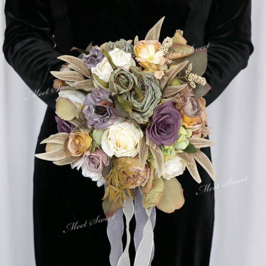 ブーケ 造花 ウェディングブーケ ブライダルブーケ シャワーブーケ 秋色 ウエディングブーケ 花嫁 フラワーブーケ 可愛い 結婚式 二次会 披露宴 カーキ