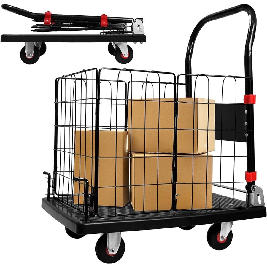 カゴ台車 90x60CM 耐荷重650KG 大型折りたたみ手押し平台車 5インチTPRホイール 折り畳み 軽量 静音 回転可能 簡単な取り付け 固定ロープ、取り付け工具、日本語