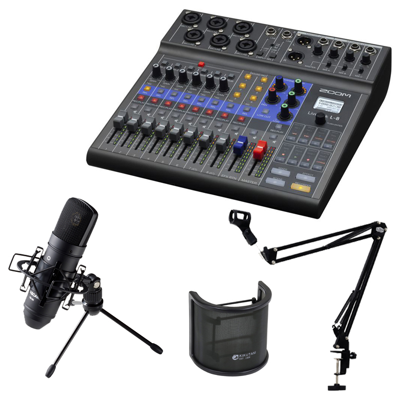 ZOOM ズーム L-8 配信 ミキサー + TM-80B コンデンサーマイク (XLRケーブル、ショックマウント、卓上スタンド 付) + MPC-1 マイクアーム + P07 ポップガード