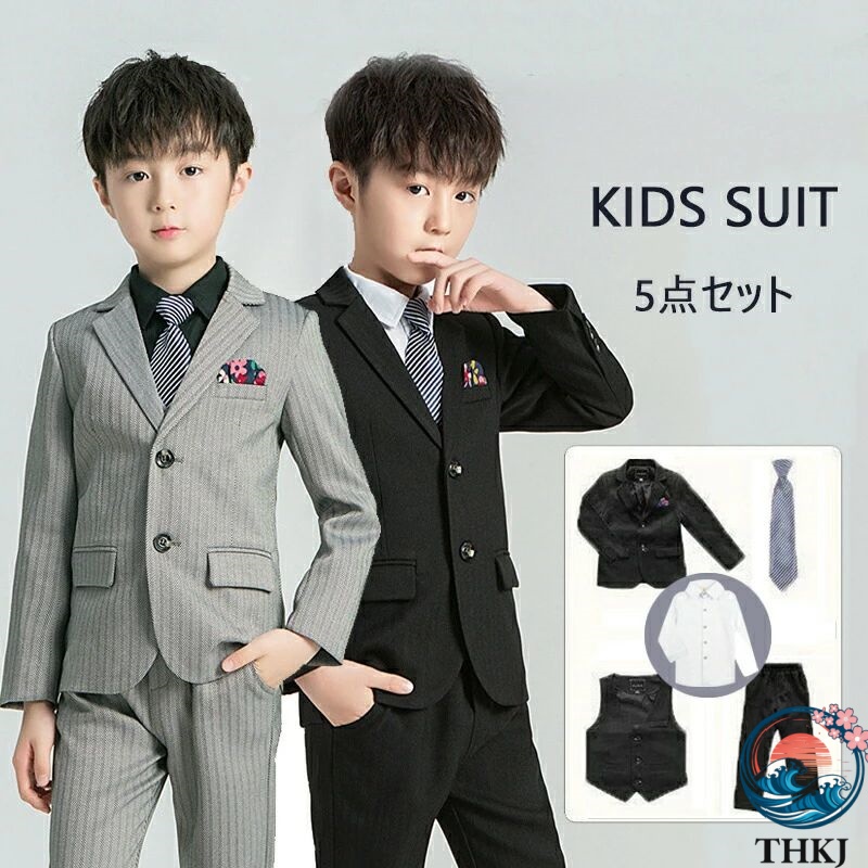 ※機械による生産のため、生地の継ぎ目の若干のズレや、形やサイズに多少の誤差が生じる場合がございますが品質上の問題はございません。予めご理解下さいますようお願い致します。卒業式 小学校 スーツ 5点セット 4 スーツ セットアップ スーツ 通販 ブラック グレー 90cm 100cm 110cm 120cm 130cm 140cm 150cm 160cm 170cm
