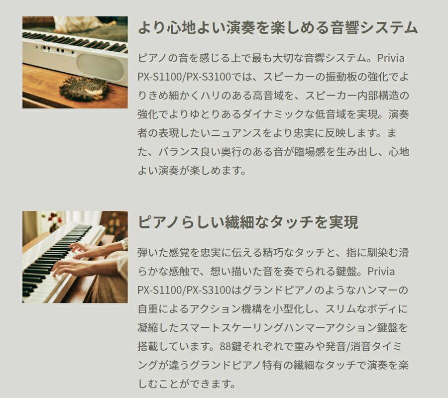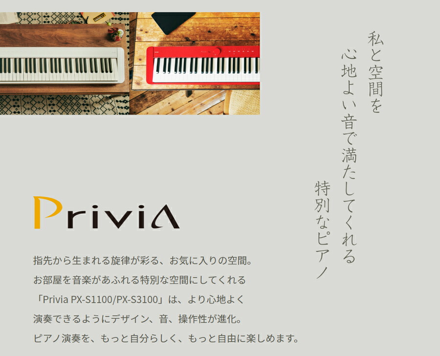 お部屋を音楽があふれる特別な空間にしてくれる「Privia PX-S1100」は、より心地よく演奏できるようにデザイン、音、操作性が進化。ピアノ演奏を、もっと自分らしく、もっと自由に楽しめます。