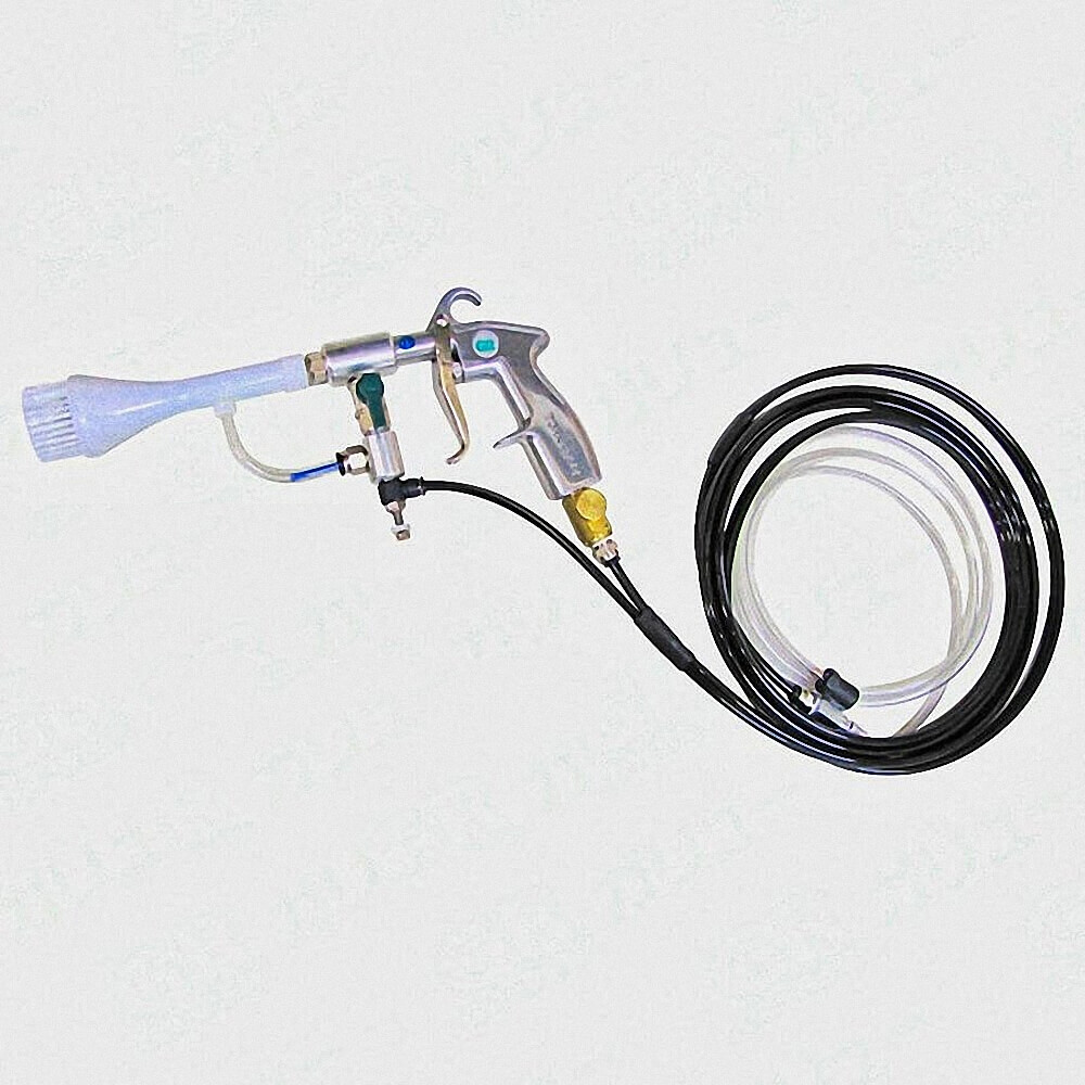 自吸ポンプを内蔵したことで、通常のブラシガンの様なドライ洗浄のほかに、セミドライ洗浄、水洗浄、水切り、乾燥、と様々な用途に幅広く対応します。使用水量は10リットルの水で約1時間連続作業が可能で高い節水効果を得られます。