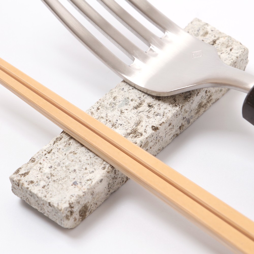 石材であるのに柔らかく、あたたかみのある素材感。独特の存在感を放ちながら、料理の邪魔にならないすっきりとした形。選んだ人のこだわりを感じさせる大谷石のカトラリーレストは蔵や町屋のお店、石のマテリアルを使用したお店などにとても相性がよくおすすめです。大谷石は壊れやすく、劣化するため、食器類としては不向きでしたが、このカトラリーレストは特殊なコーティングを施すことで、水や汚れに強く耐久性のあるものにしています。デザインもシンプルなので和洋中の種類を選ばず、様々な料理にお使いいただけます。その独特の素材感が民藝運動の主唱者であった柳宗悦にも愛され、今も尚多くの建築家やデザイナーを魅了する大谷石。約2,000万年前の火山噴火により堆積した凝灰岩で、栃木県宇都宮市大谷地区でのみ産出される、希少価値の高い石材です。<br>「カトラリーレストS」は長さが8cmで箸置きよりも薄く、幅が少し広め。箸置きとしてはもちろん、中華に使ってもスタイリッシュです。<br><br>サイズ:80×20×10mm<br>重量:--g<br>材質:天然石<br>生産国:日本