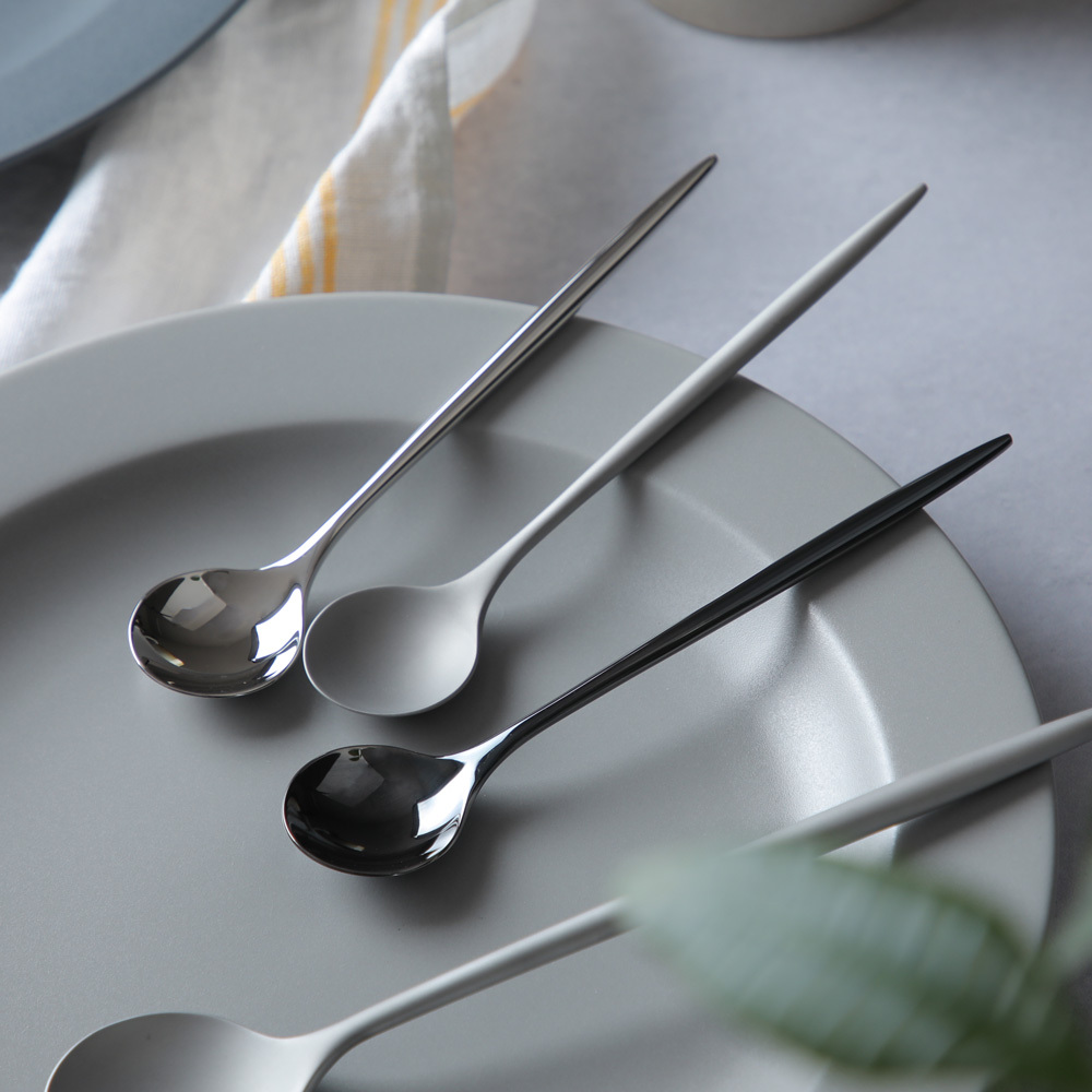関連キーワード:カトラリー ナイフ フォーク スプーン スタイリッシュ かっこいい プロダクト デザイン デザイナー 中野科学 新潟県燕市 ブラック マット シルバー 鏡面 ミラー 仕上げ 丸い 長い 細い 繊細 シンプル シルエット モノクロ ティースプーン スイーツ用スプーン プリン ヨーグルト スープ ミニスプーン