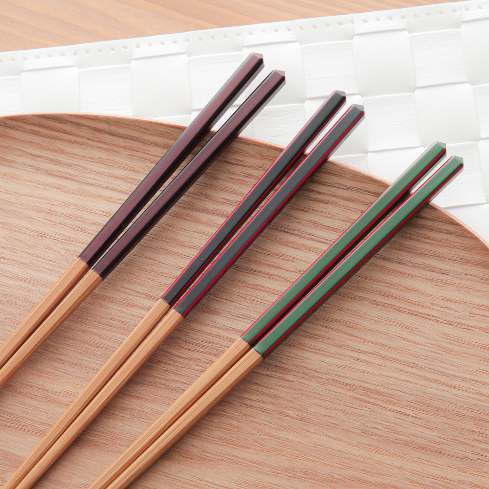 天然素材の孟宗竹から作られた落ち着いた色使いの竹のお箸です。孟宗竹の特徴を生かし、細くしなやかに仕上げています。機械ではできない細い箸先は、職人による手作りの証です。小さなものでもつまみやすく、小魚の骨なども取りやすくなっています。頭部はピラミッド状にカットされ、二重塗りの下塗を浮き上がらせる研ぎ出し方式で色合いもきれいです。