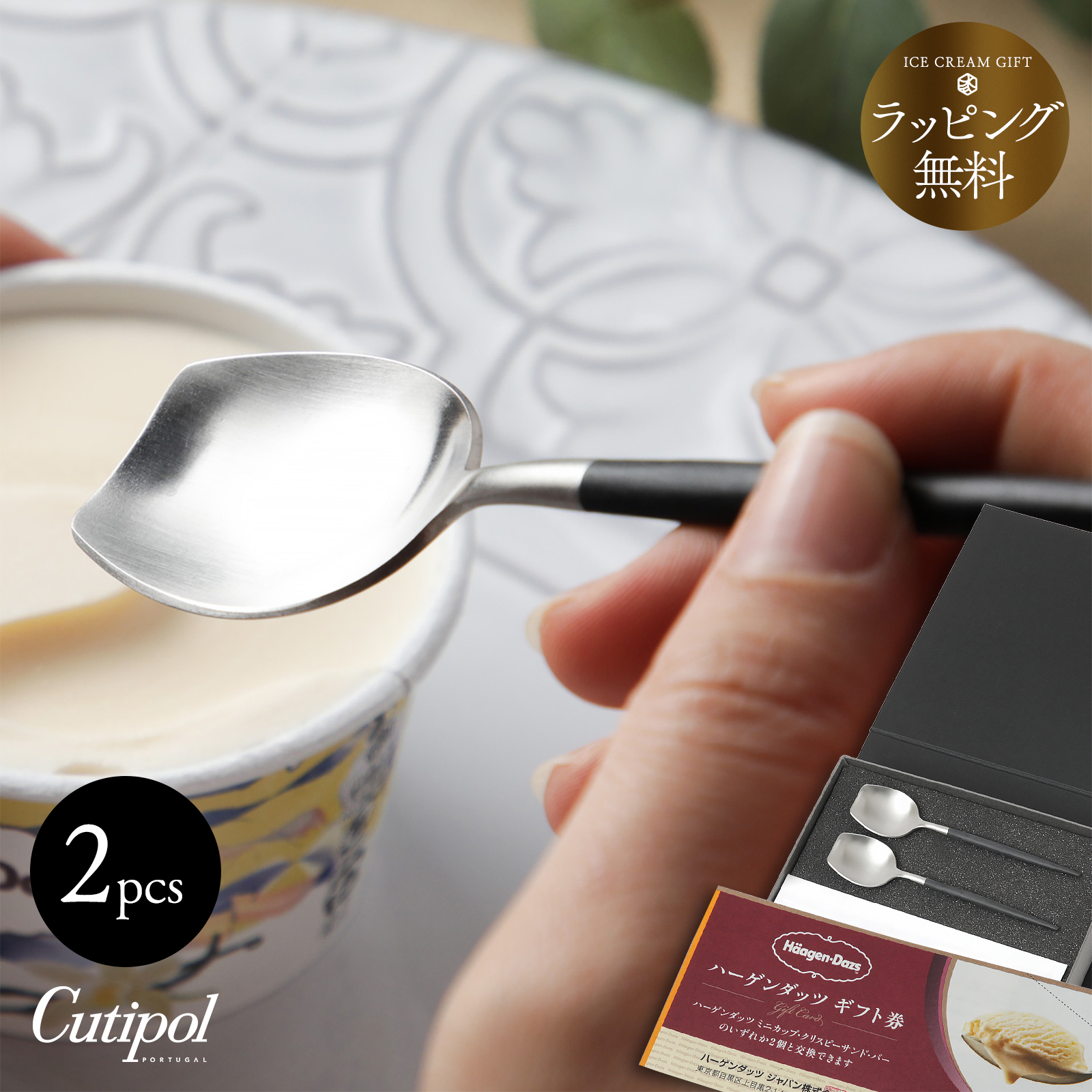 洗練されたデザインと機能美が魅力のポルトガルを代表するカトラリーブランドクチポールから新しくアイスクリームスプーン(甘味匙)が登場。京都匙亀ではこのスプーンをより楽しんでいただけるよう、世界中で愛されるアイスクリームブランド「ハーゲンダッツ」のギフト券と、特別なギフトボックスをセットにしてお届けいたします。