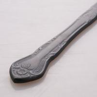 真っ黒の見た目が目を引く珍しいカトラリーシリーズ。ハンドルの細部に優美な紋様が施されています。黒酸化発色によりステンレスを塗装すること無く黒色に変色させているため、深い傷を付けないかぎり色が剥がれてくる心配がありません。見た目にインパクトがあるので、プレゼントやモデルルームなどの撮影小道具としても使えますね。
