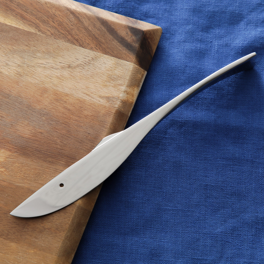 泳ぐ魚のフォルムをデザインした遊び心いっぱいのカトラリー。目、背ビレ、尾ビレがついており、それぞれにかわいらしい表情があります。魚らしい流線型のフォルムは輝く鏡面と相まって美しさ・スタイリッシュさも引き立ち、子どもも大人も家族で楽しめるカトラリーです。テーブルを楽しそうに泳ぐカトラリーはテーブルをにぎやかに演出します。