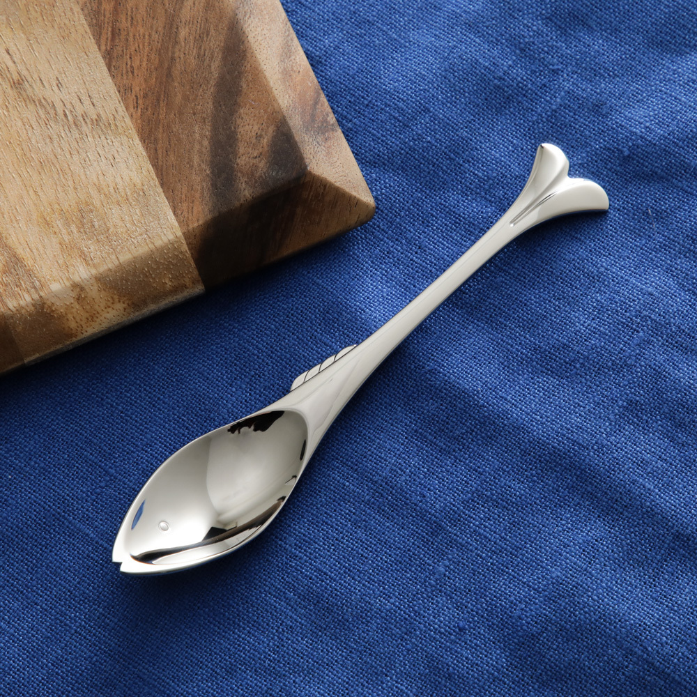 泳ぐ魚のフォルムをデザインした遊び心いっぱいのカトラリー。目、背ビレ、尾ビレがついており、それぞれにかわいらしい表情があります。魚らしい流線型のフォルムは輝く鏡面と相まって美しさ・スタイリッシュさも引き立ち、子どもも大人も家族で楽しめるカトラリーです。テーブルを楽しそうに泳ぐカトラリーはテーブルをにぎやかに演出します。