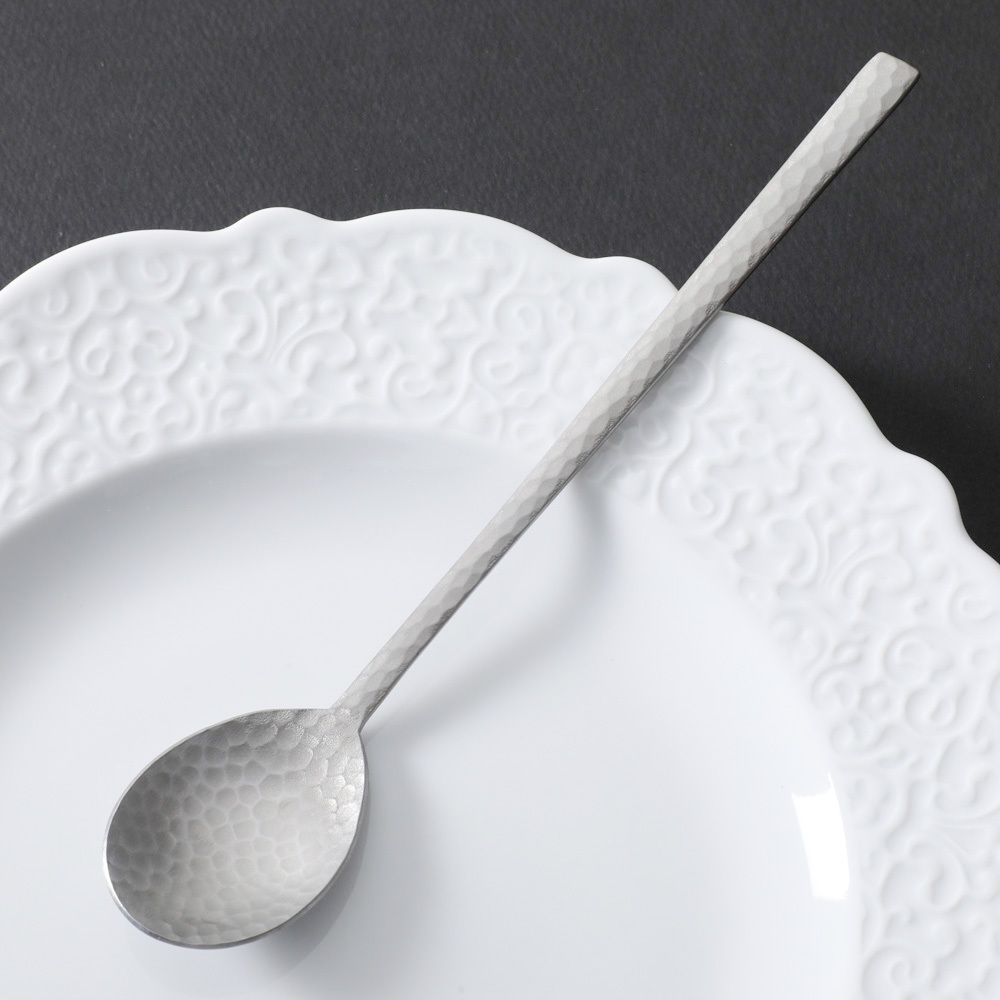 鎚目のカトラリーでも珍しく、ツボ部分にまで鎚目がつけられたロングスプーンです。全面に施された手作り感のある鎚目が暖かさと高級感を引き立ててくれて、傷も目立ちにくくなります。海外ブランドのカトラリーのように大きすぎることがなく、日本人の体のサイズに合わせたちょうどいい大きさに作られています。新潟県燕市で生産されているこちらのスプーンは、持ちやすさにこだわり柄に厚みとゆるやかなカーブを持たせることで手の形にフィットするようにデザインされています。