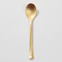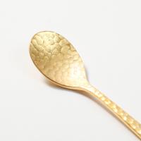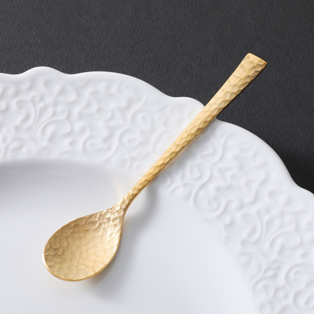 鎚目のカトラリーでも珍しくツボ部分にまで鎚目が施されたティースプーンです。美しく輝くゴールドが目を惹きます。全面に施された手作り感のある鎚目が暖かさと高級感を引き立ててくれて、傷も目立ちにくくなります。海外ブランドのカトラリーのように大きすぎることがなく、日本人の体のサイズに合わせたちょうどいい大きさに作られています。新潟県燕市で生産されているこちらのスプーンは、持ちやすさにこだわり柄に厚みとゆるやかなカーブを持たせることで手の形にフィットするようにデザインされています。