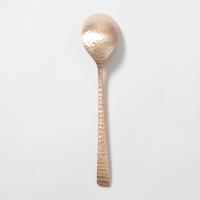 鎚目のカトラリーでも珍しくツボ部分にまで鎚目が施されたディナースプーンです。美しく輝くピンクゴールドが目を惹きます。全面に施された手作り感のある鎚目が暖かさと高級感を引き立ててくれて、傷も目立ちにくくなります。海外ブランドのカトラリーのように大きすぎることがなく、日本人の体のサイズに合わせたちょうどいい大きさに作られています。新潟県燕市で生産されているこちらのスプーンは、持ちやすさにこだわり柄に厚みとゆるやかなカーブを持たせることで手の形にフィットするようにデザインされています。
