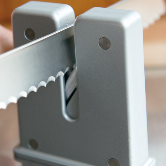一般の包丁やナイフの他、ブレッドナイフのような波刃のナイフにも使える優れもの。取手を握り、V字に重なった2本のスティールの上にナイフの刃を乗せて、前後に4、5回スライドさせるだけ。本体はABS樹脂で軽量、ハンドル部分はフック掛けもでき、場所を取らないコンパクトサイズで、引き出し収納も可能です。バターナイフやペティナイフなどの小型ナイフも、手軽に研ぎやすく便利。イギリスのメーカー、テイラーズ・アイ・ウイットネスのロングセラーシャープナーです。