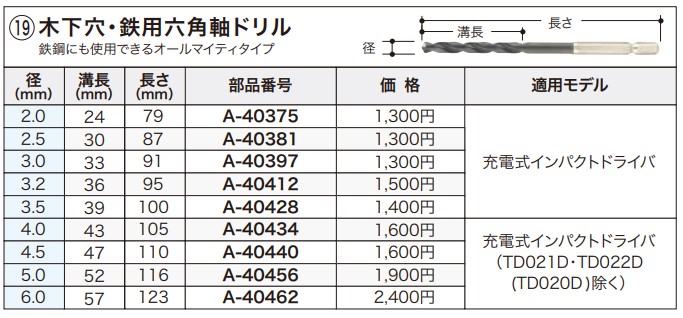 マキタ 木下穴・鉄用六角軸ドリル 径2.5×溝長30×長さ87mm <A-40381>