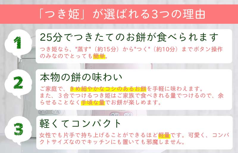 3合でつけるつき姫なら、ご家族で食べきれる量でつけるので(まるもち10個分)、おもちを余らせることもなく、手ごろな量でおもちつきが楽しめます。