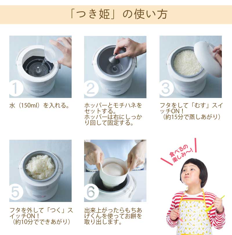 つき姫なら、むすからつくまでボタン操作のみで簡単におもちをつくことができます。