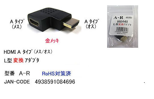 ■製造元/商品型番:カモン(COMON)製:A-R■仕様:HDMI-L型変換アダプタ(Aタイプ/オス⇔メス)■ROHS対応■生産国:中国製■JANコード:4938591084696■梱包形態:ビニールによる簡易梱包