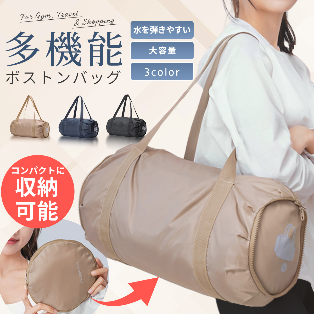 ジム・ヨガ、旅行・出張、お買い物、部活やスポーツシーンなど、あらゆるシーンで活躍する万能バッグです。
