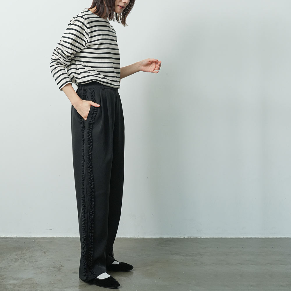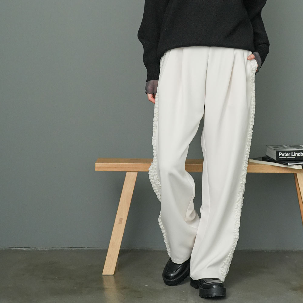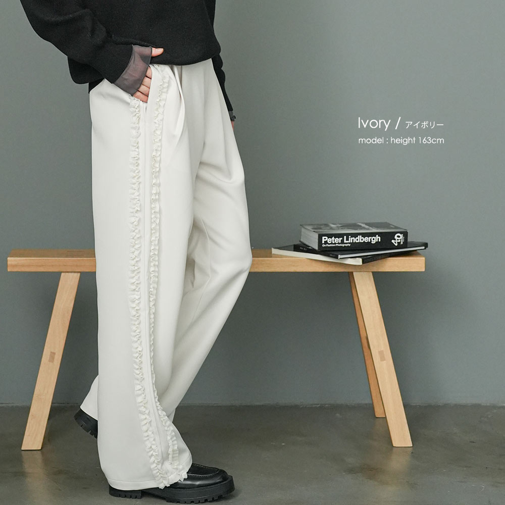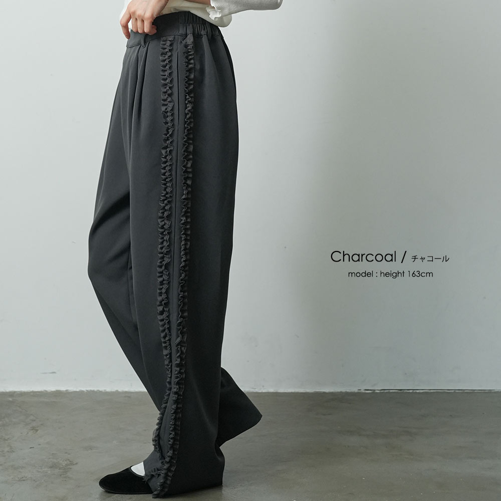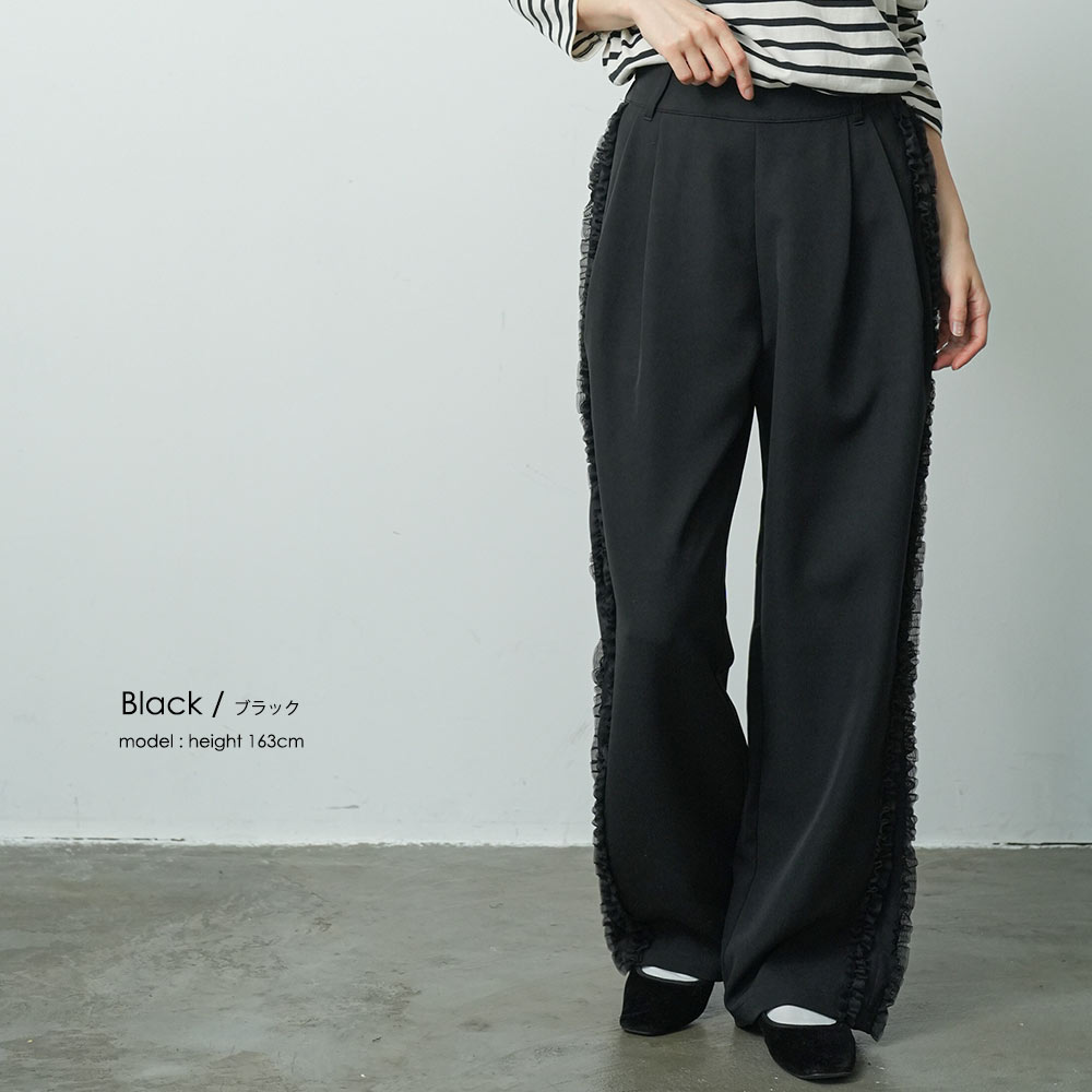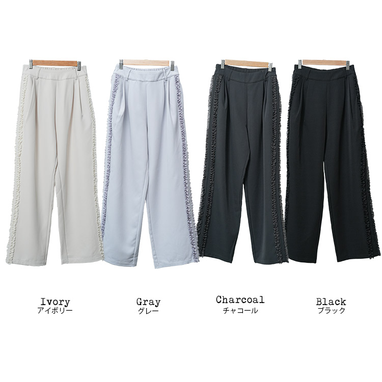 サイドフリルパンツ ウェストゴム サイドポケット 春夏秋冬 ボトムス レディース 美脚 脚長 春 夏 秋 冬 オールシーズン サイドチュールフリルパンツ ワイドシルエッ