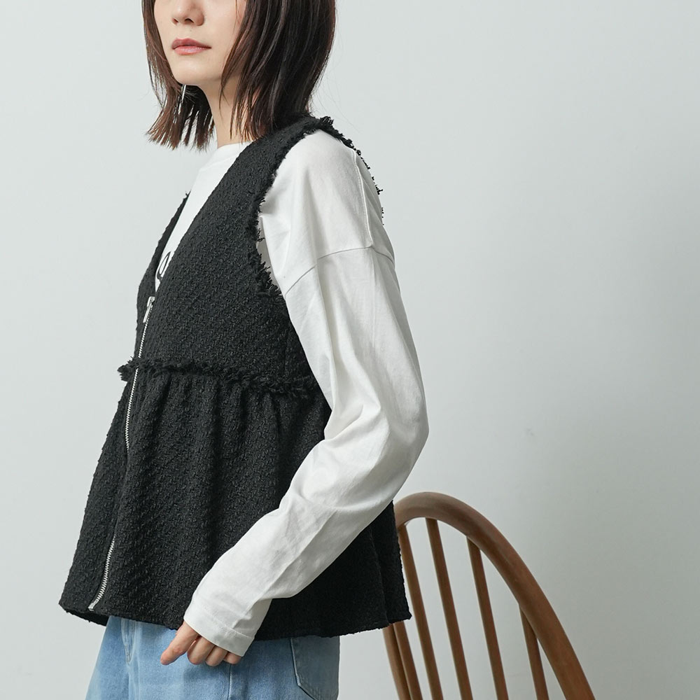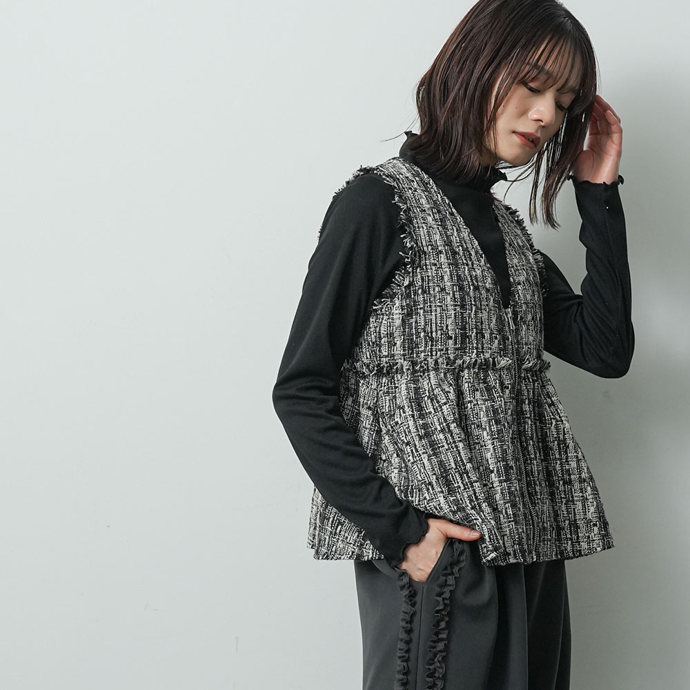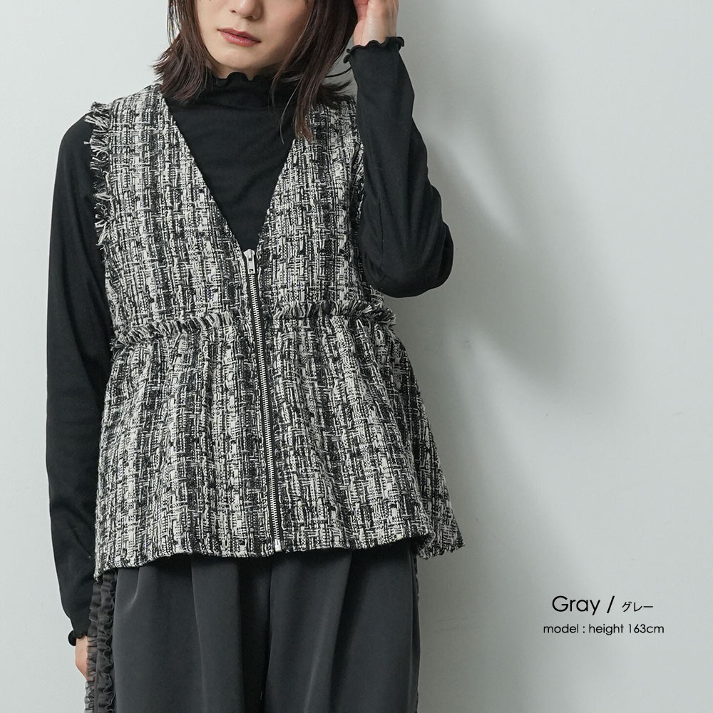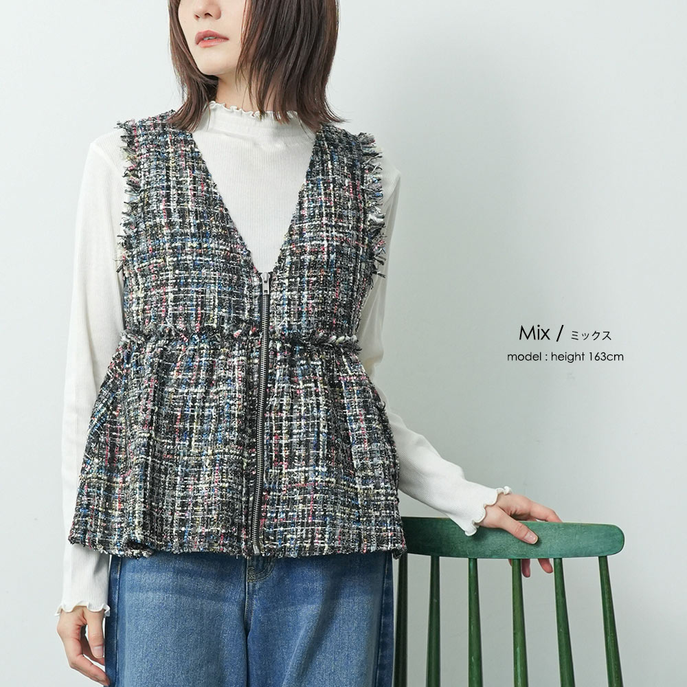 ミックスツィードペプラムベスト ペプラムベスト ツィードベスト セットアップ 無地 タートルネック 重ね着 重ね着コーデ ゆったりサイズ シャツコーデ レイヤードコーデ ジップアップベスト トレンドベスト 春 秋 冬 大きいサイズ おおきいサイズ
