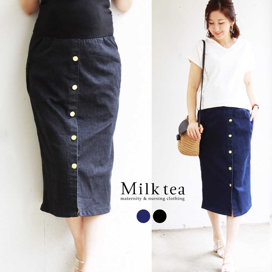 マタニティ 服 スカート ゴールドボタン・お腹楽ちん・ビューティデニムスカート M L 産前産 マタニティ スカート 秋 冬 安い マタニティウエア