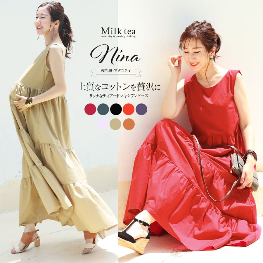 マタニティ 服 授乳服 ワンピース ニーナ ジッパータイプの授乳口 お宮参り マキシワンピース ノースリーブ 夏 綿100% マタニティ 服 マタニティウエア