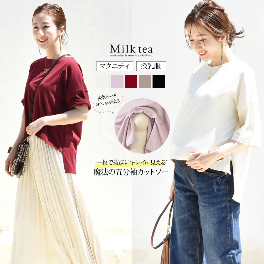 新しいママのベーシック!前後ヘムラインでパンツでもスカートでも、ボトムスを選ばずすっきり着られる授乳&マタニティ対応のオリジナルカットソーです。