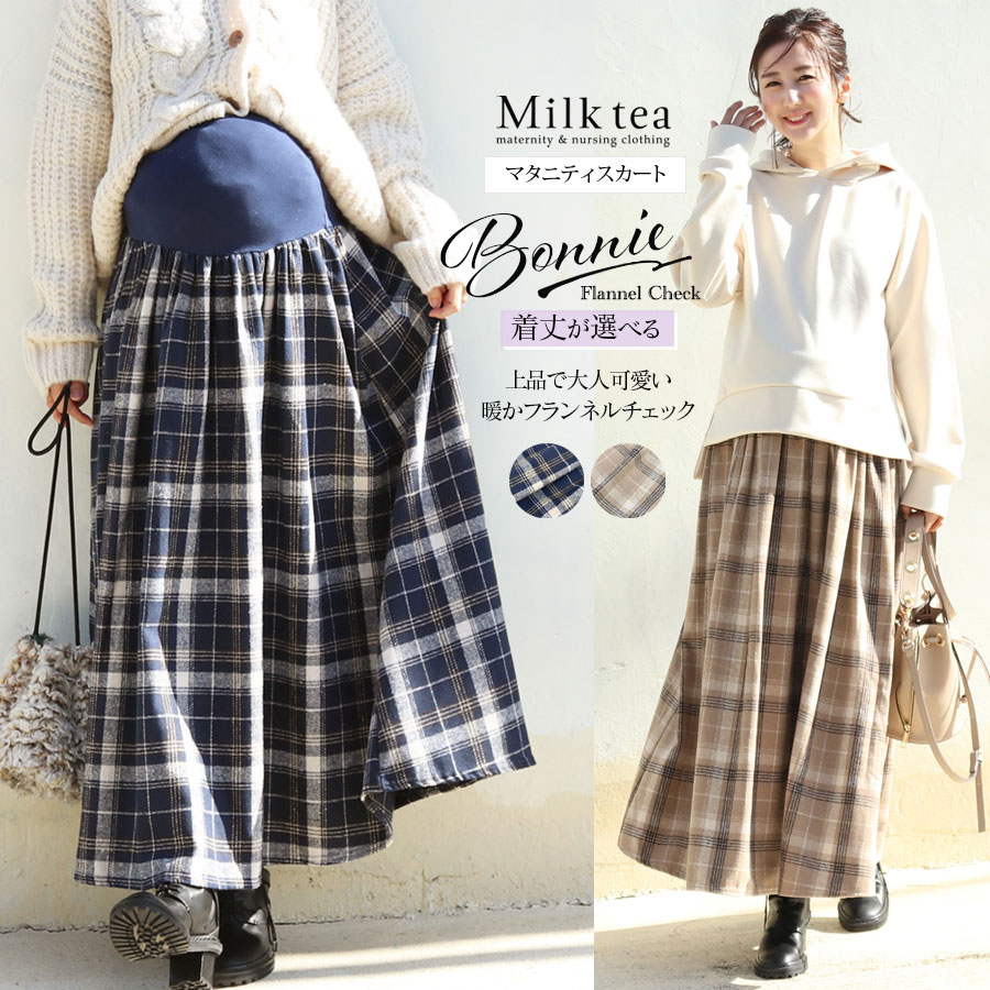 暖かくて知的なフランネルチェックを使ったマタニティ対応フレアースカートです。