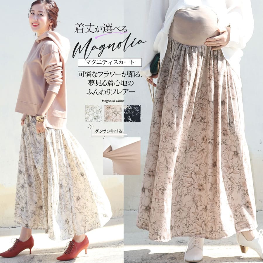 ロマンティックで繊細な大人のフラワー柄をプリントしたマタニティ対応2WAYフレアースカートです。