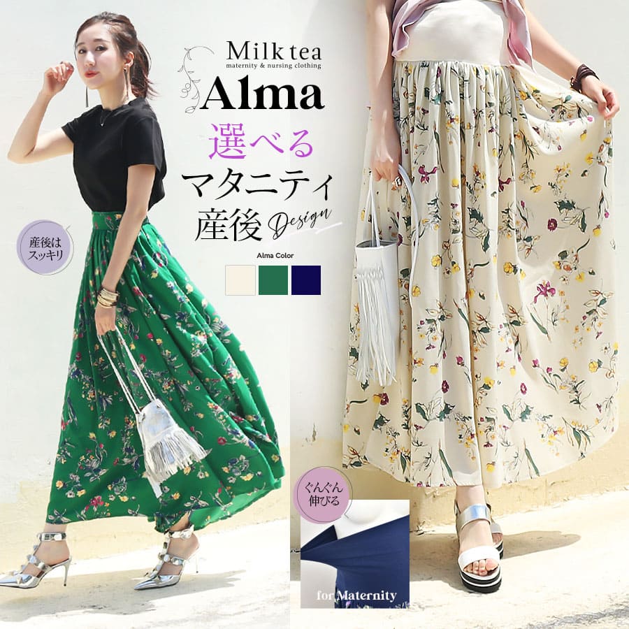 商品カテゴリ:授乳服 授乳 マタニティ服 マタニティ 妊婦服 妊婦 妊娠 出産 産前産後 授乳期 妊娠初期 妊娠中期 妊娠後期 出産準備 マタニティスカート マタニティボトムス 産後スカート スカート ロング ロングスカート フレアースカート フラワー柄 花柄 ボタニカル 通年 オールシーズン 大きいサイズ レディース 春 夏 秋 冬 Milk tea ミルクティー ミルクティ