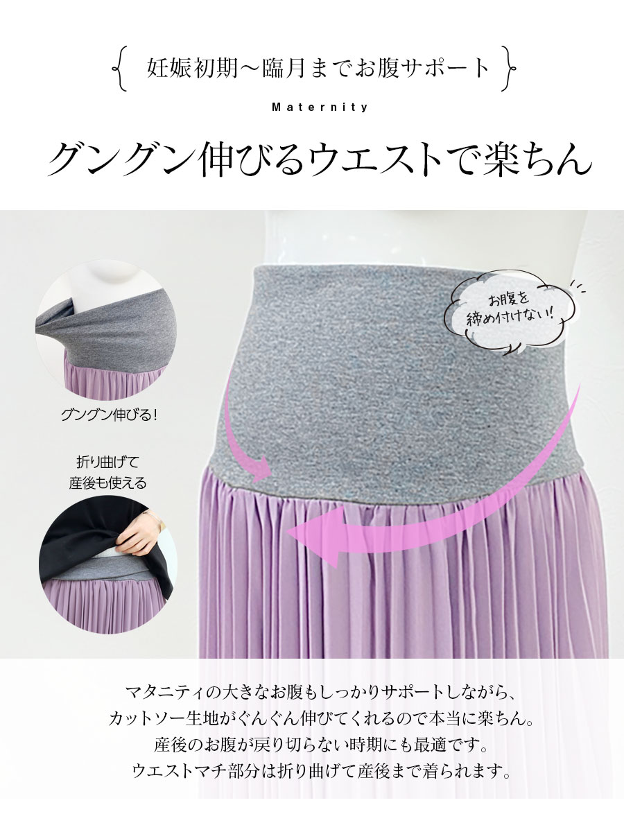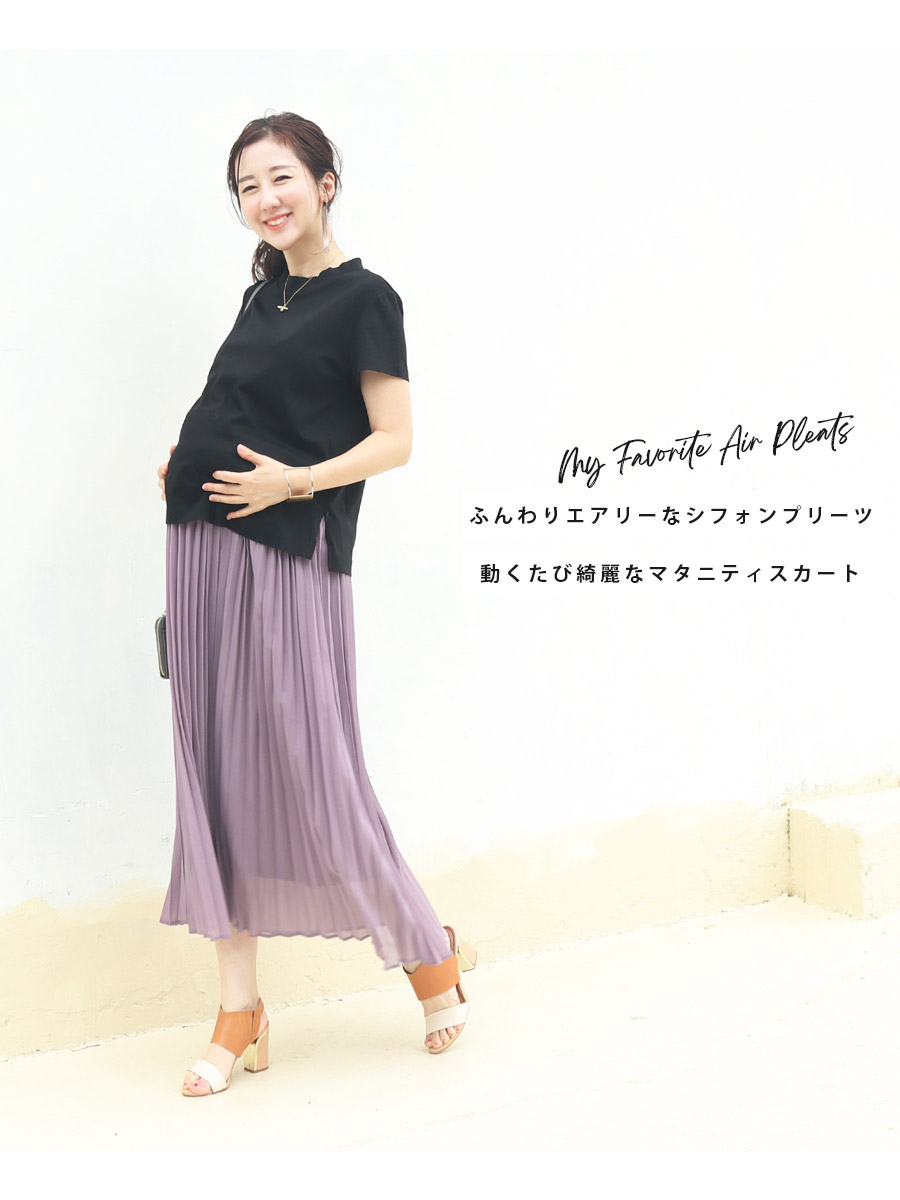 サラサラのシフォンプリーツが綺麗なマタニティスカートです。