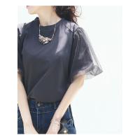 シンプル&ベーシックなTシャツに、ボリューム感あるパフスリーブにチュールをあしらった着映えする綿混素材を使ったフェミニンなトップスです。