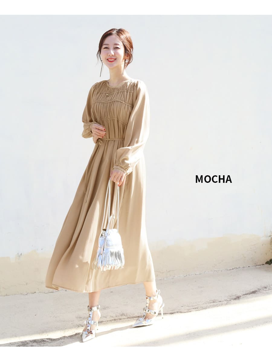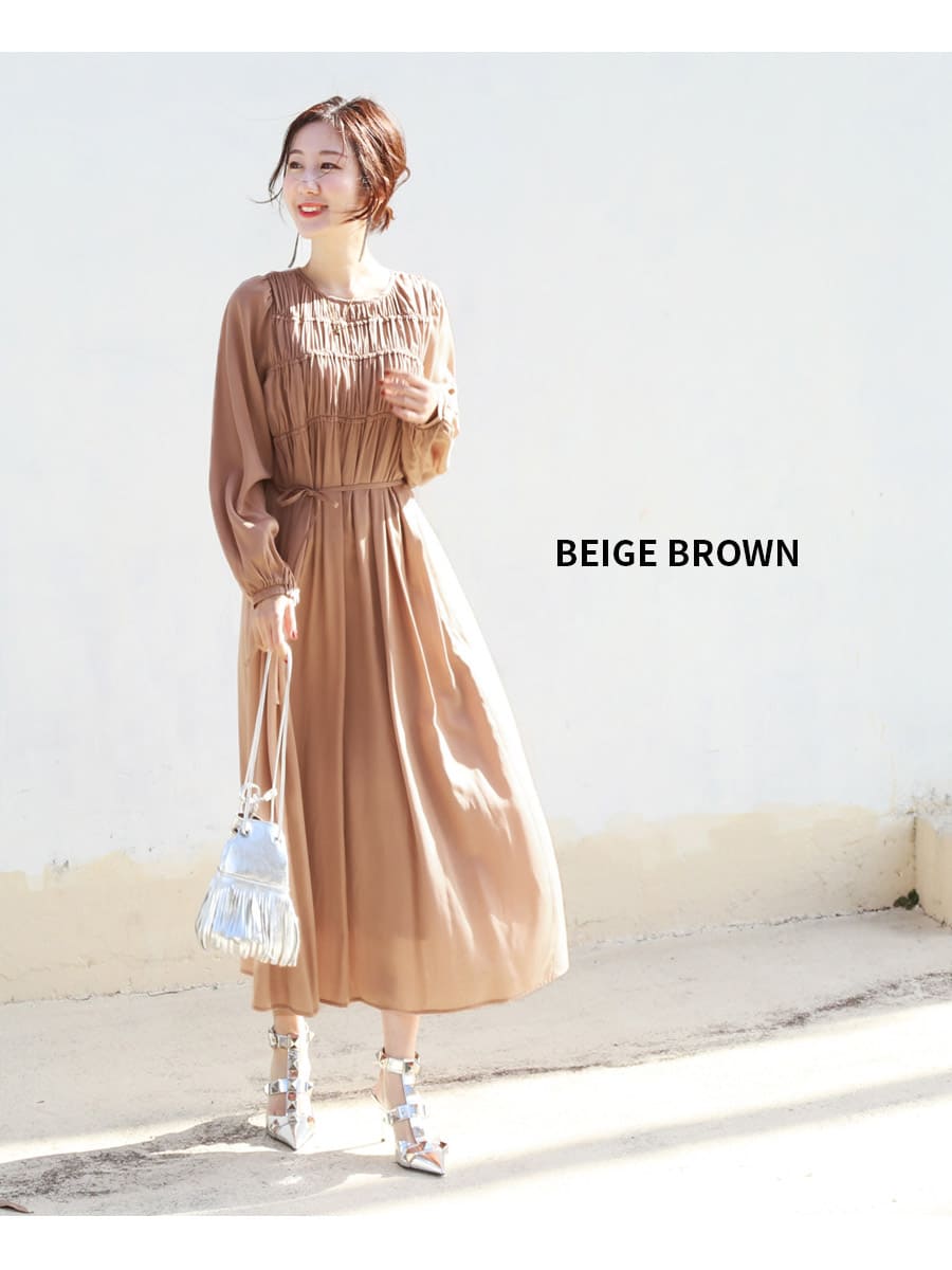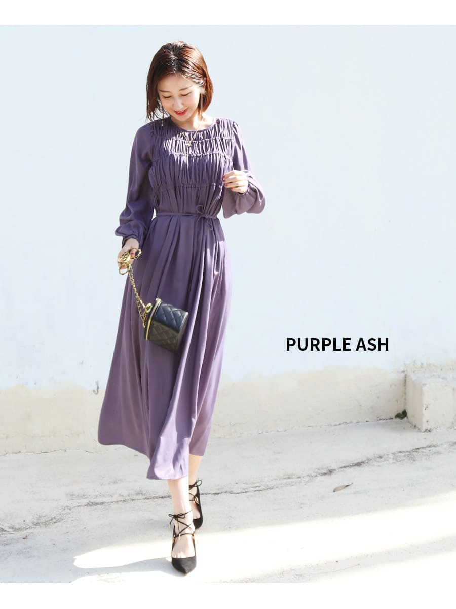 さらっとした着心地のワンピースは、控えめな華やかさを添えるシャーリングと、ふんわりふくらんだ袖デザインがレディな雰囲気。