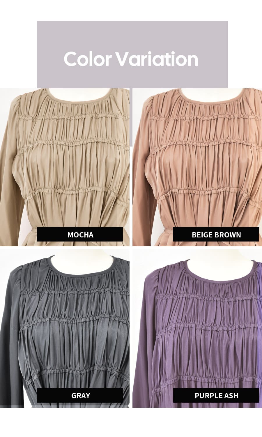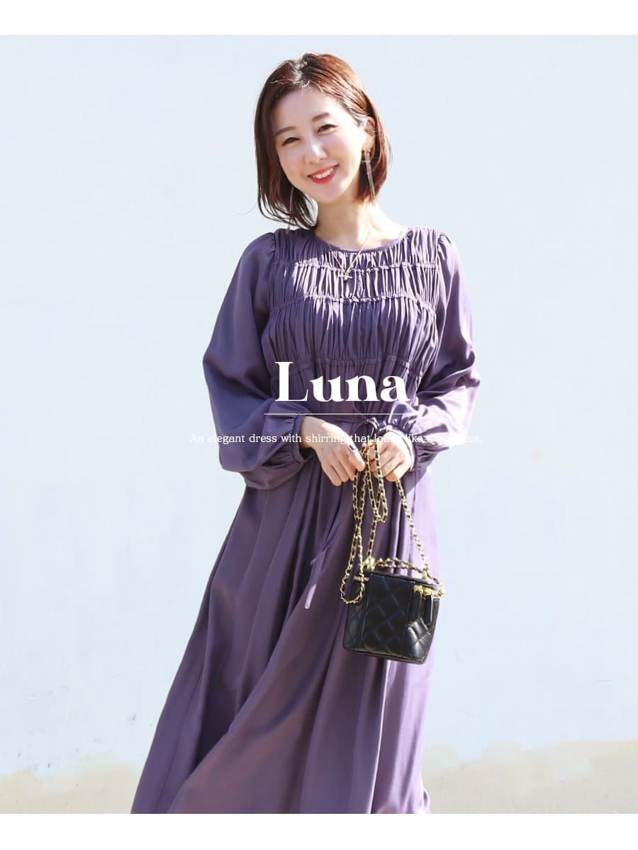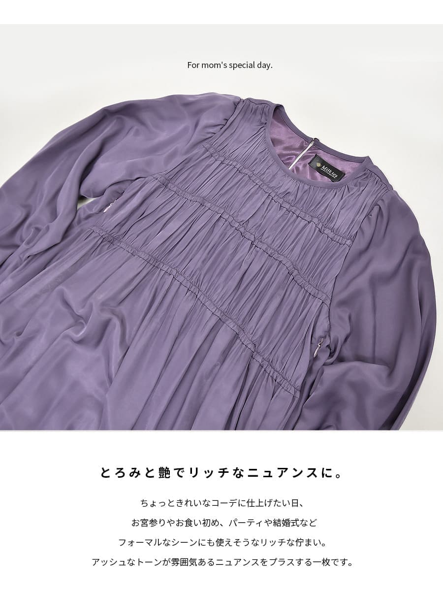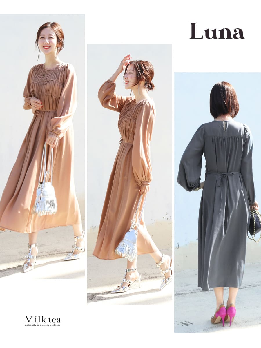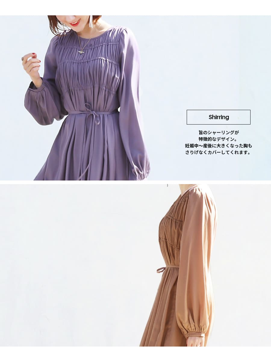 胸のシャーリングデザインが上品で可愛い、とろみ&リッチな光沢が美しい授乳ワンピースです。