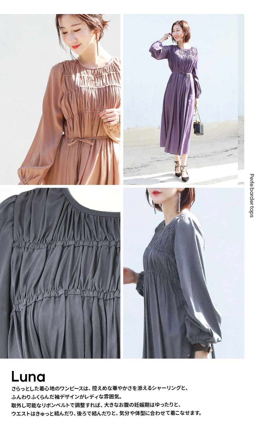 取外し可能なリボンベルトで調整すれば、大きなお腹の妊娠期はゆったりと、ウエストはきゅっと結んだり、後ろで結んだりと、気分や体型に合わせて着こなせます。