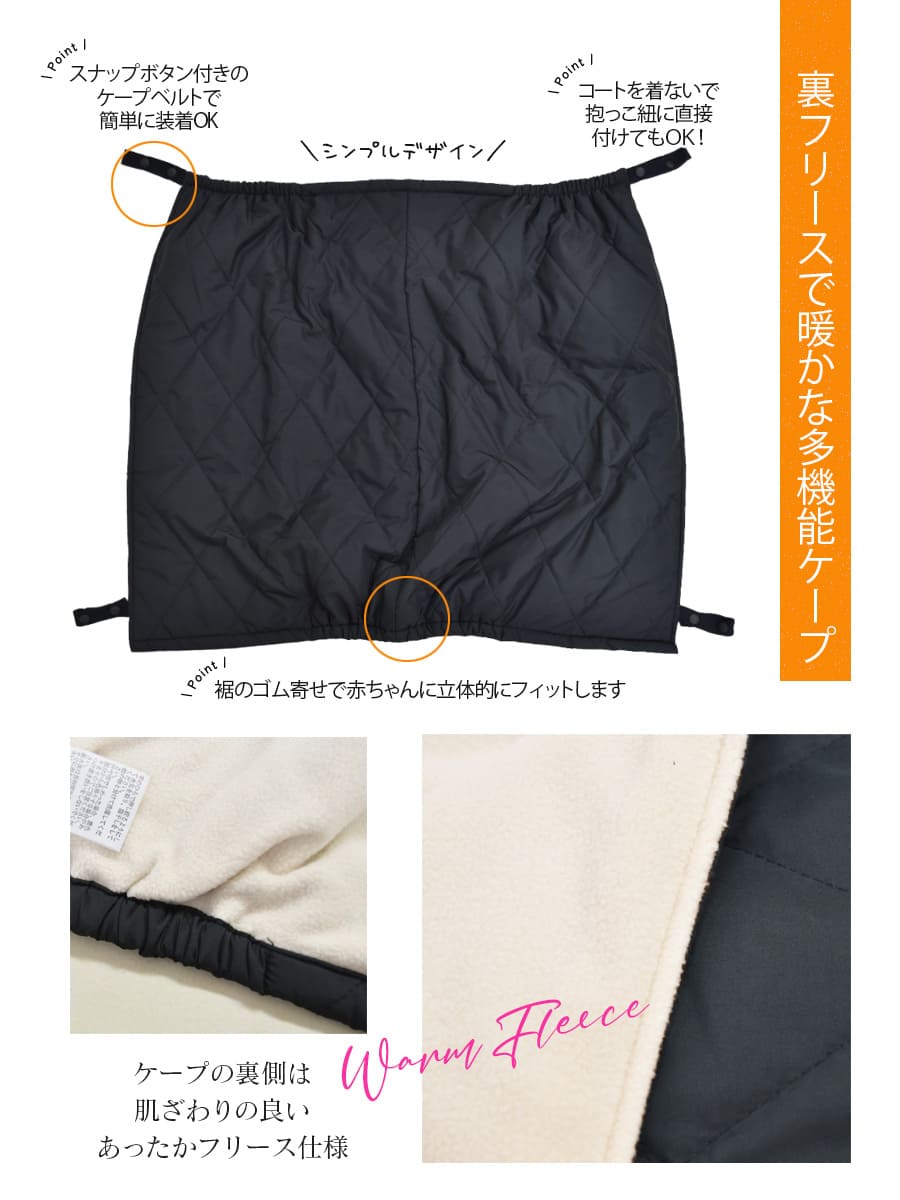 前抱っこに使えるケープ付きデザインで、ケープはおんぶにも使える仕様。