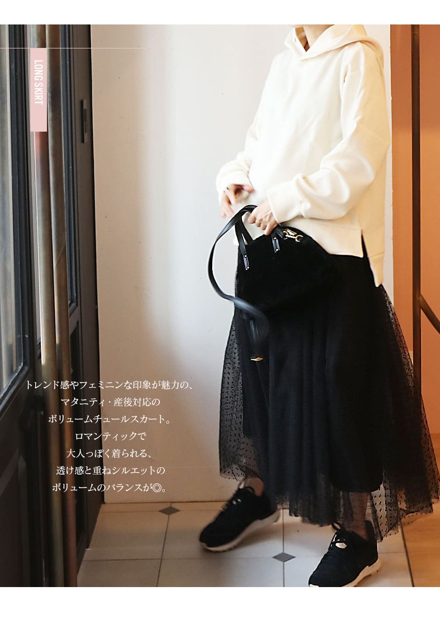 トレンド感やフェミニンな印象が魅力の、マタニティ・産後対応のボリュームチュールスカート。