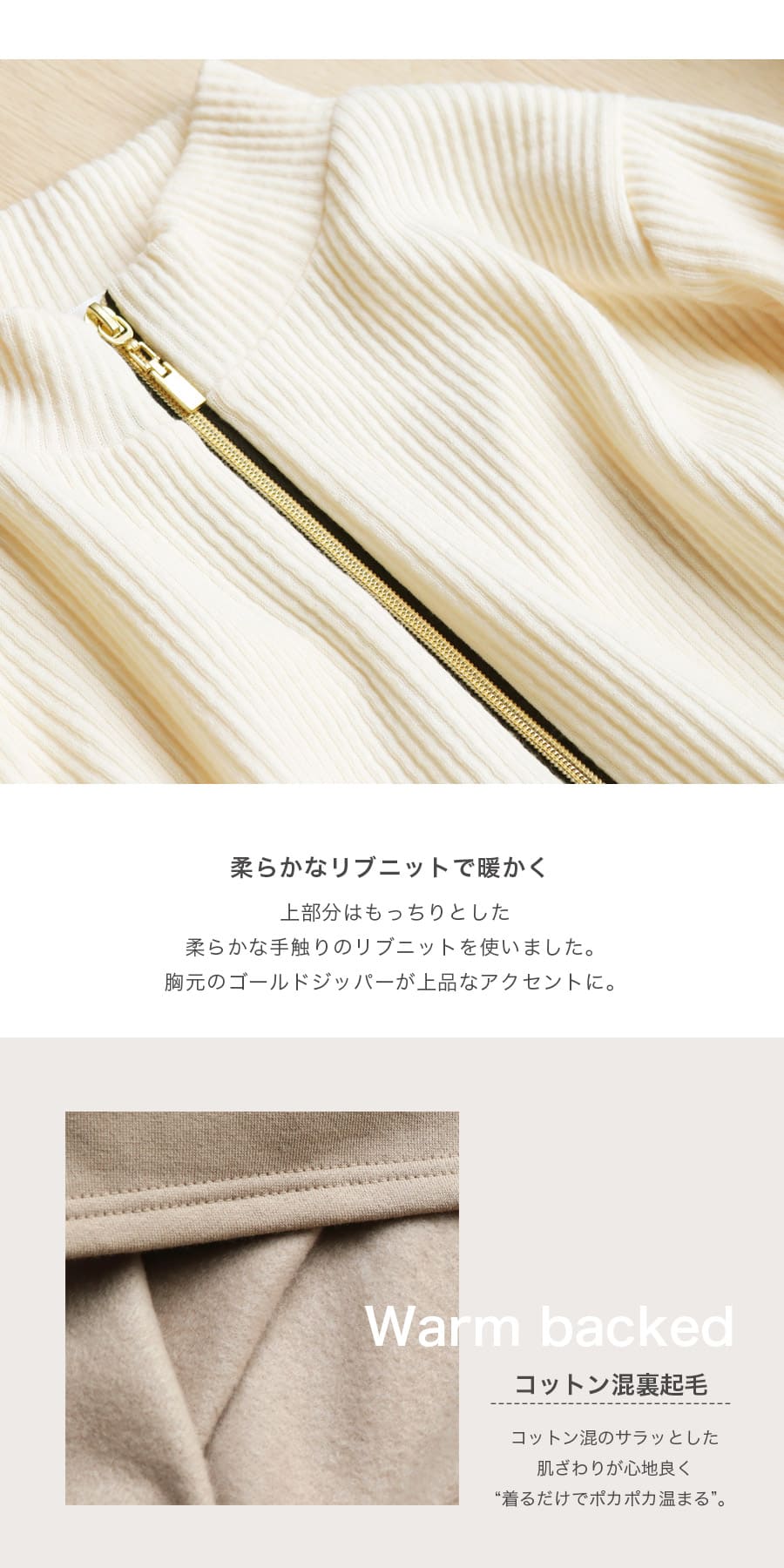 ●ほど良いタートルネックとアクセントのゴールドジッパー。