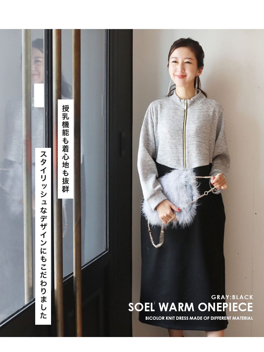 暖かで柔らかなニット×裏起毛スウェットとバイカラーで仕上げた<マタニティ×授乳対応>ワンピース。