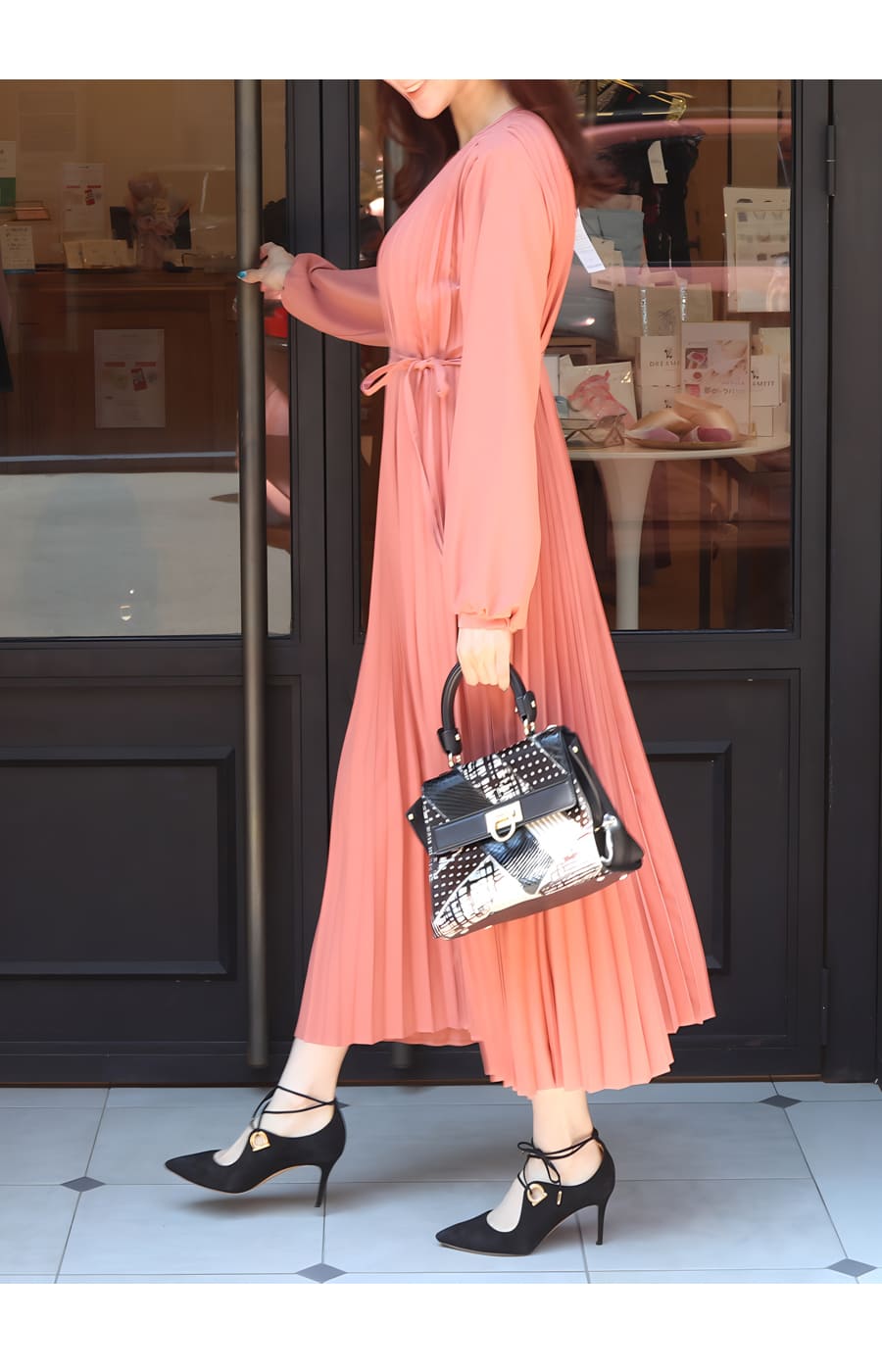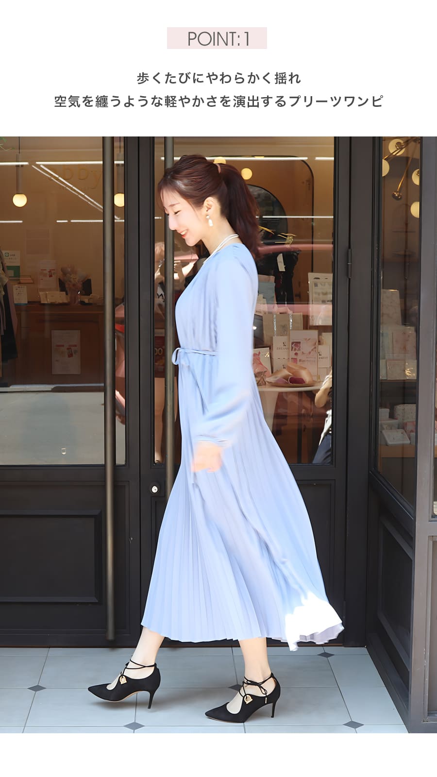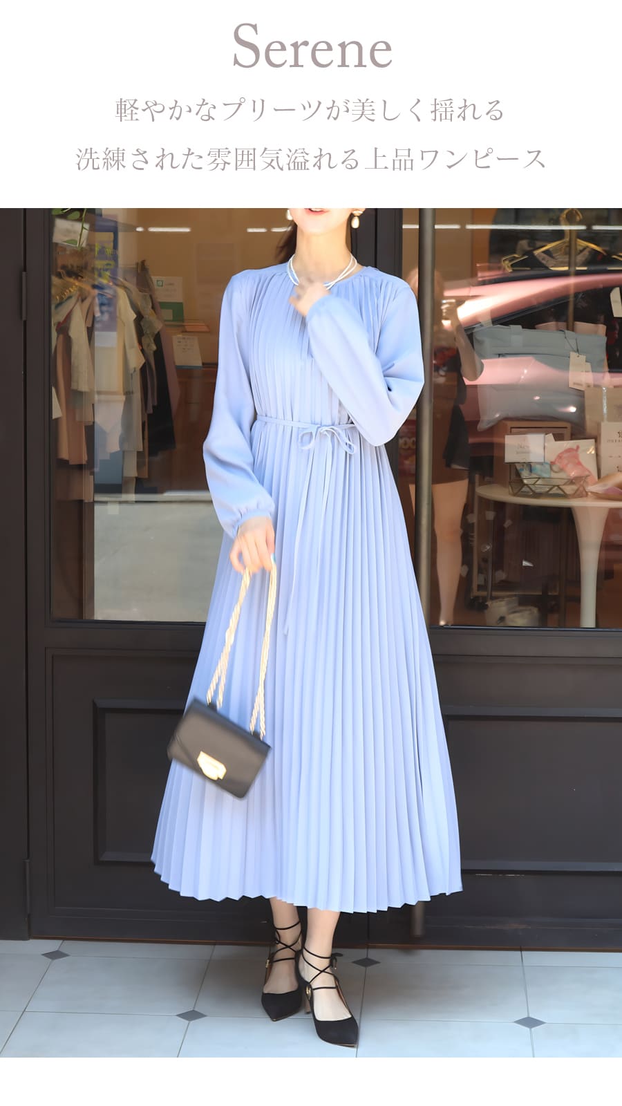 繊細に施されたプリーツが、歩くたびにやわらかく揺れ、空気を纏うような軽やかさを演出します。