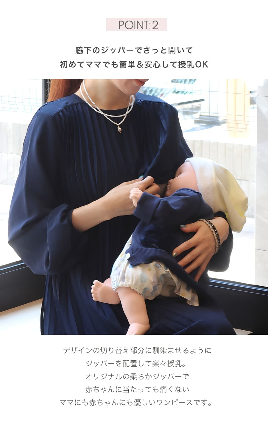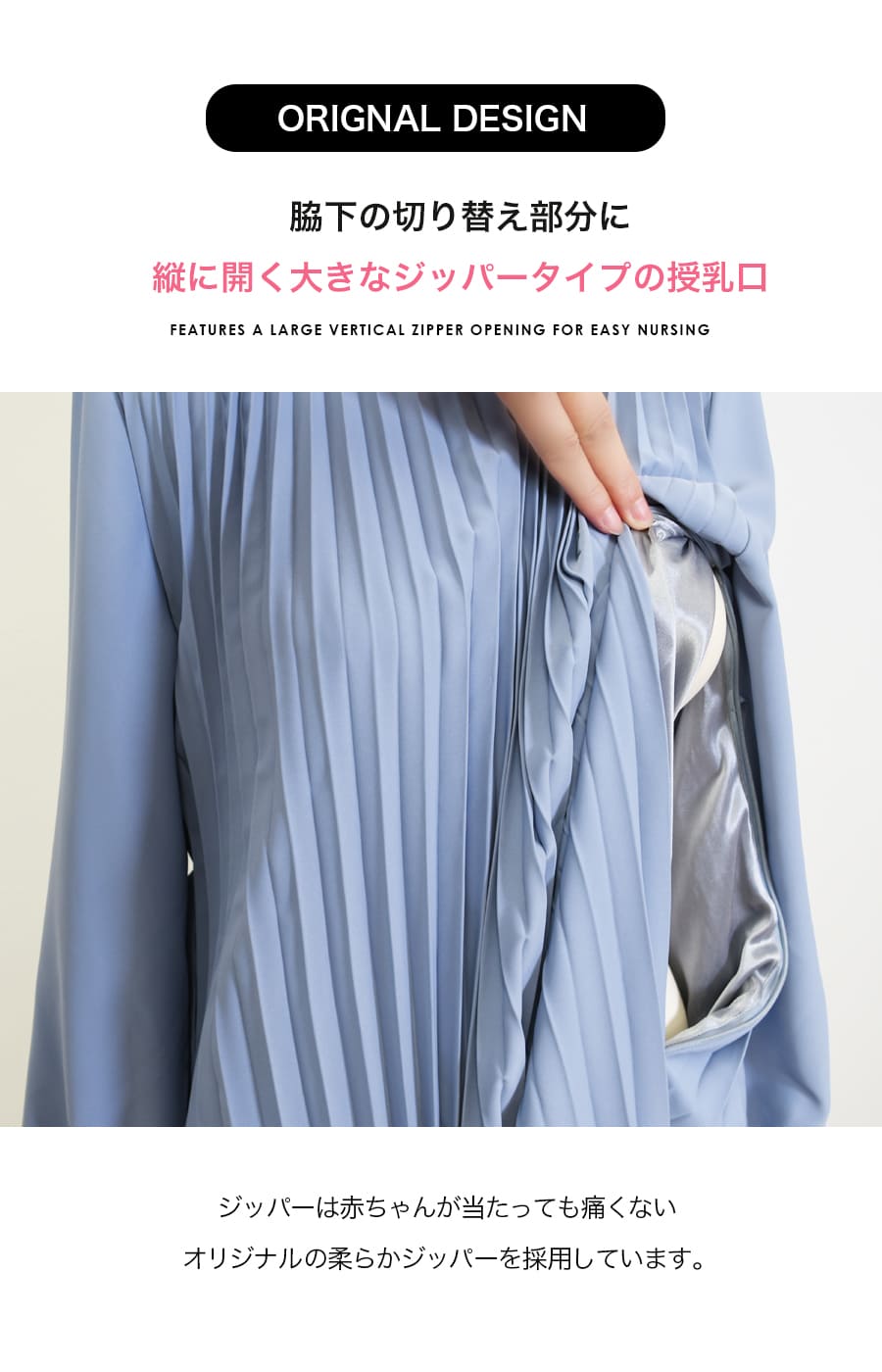 ●脇下になじませたジッパーを開くだけの簡単授乳口は、さっと開くだけで簡単授乳ができます。