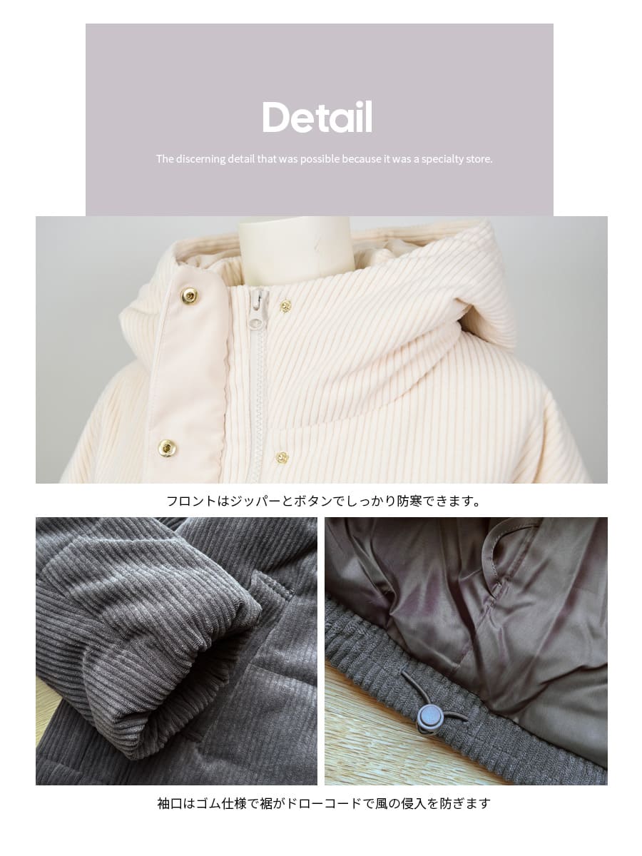 やわらかなコーデュロイ素材に、ふっくら軽い中綿をたっぷりIN。
