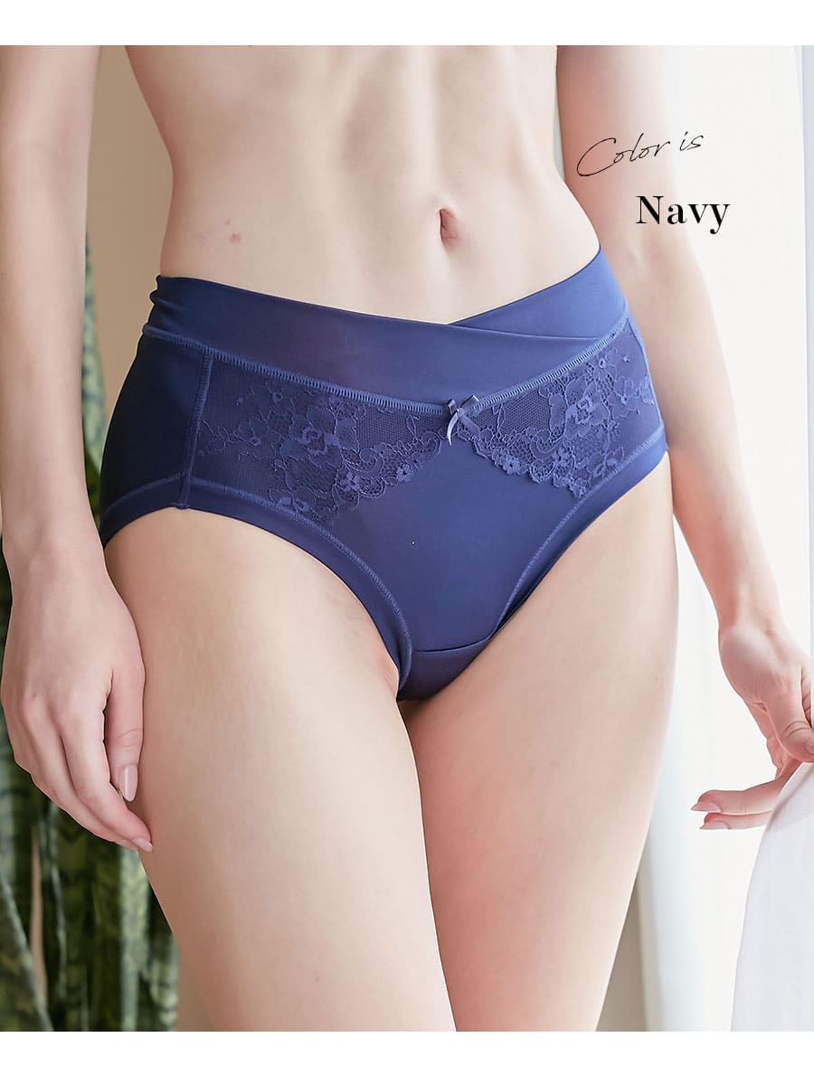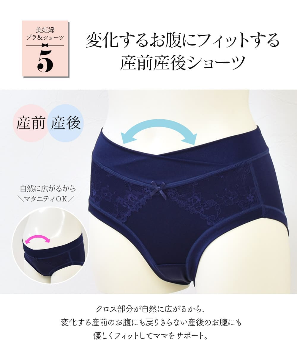 ショーツは産前産後使えるデザインで前のクロス部分が自然に広がり、妊娠初期〜臨月、またお腹の戻りきらない産後までずっと使えます。縫い目はフラット&ゴム不使用で優しい着心地。またマチ部分には綿100%を使用しました。