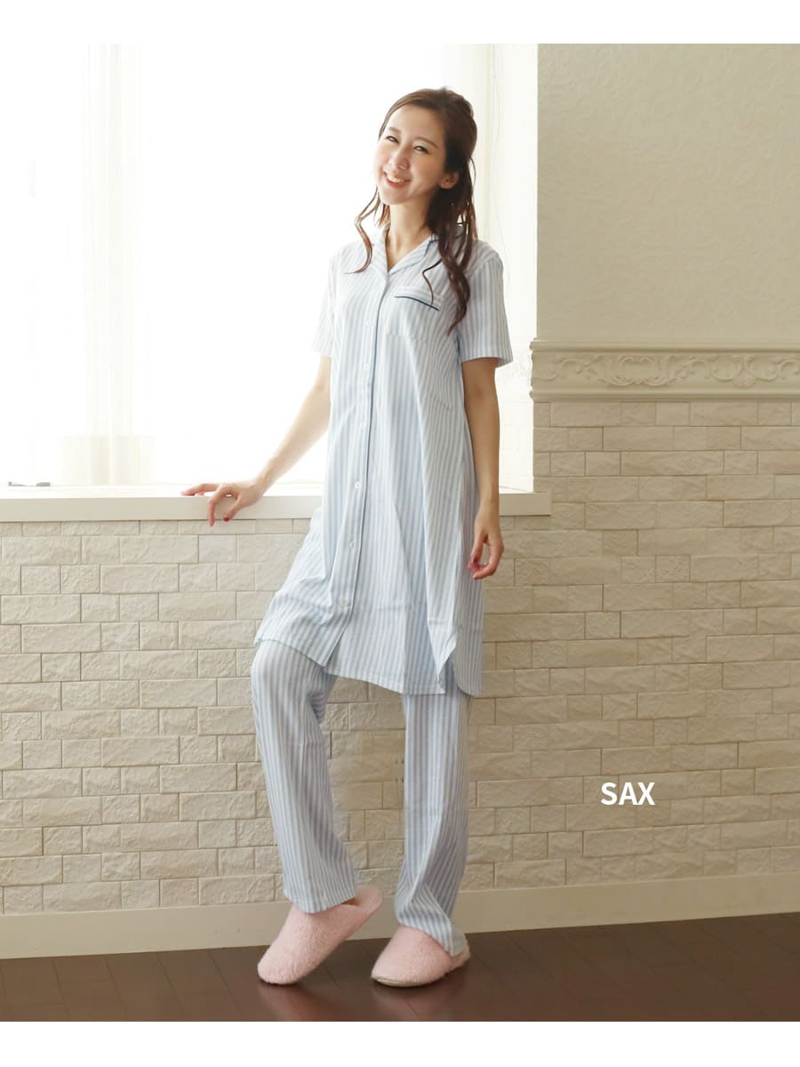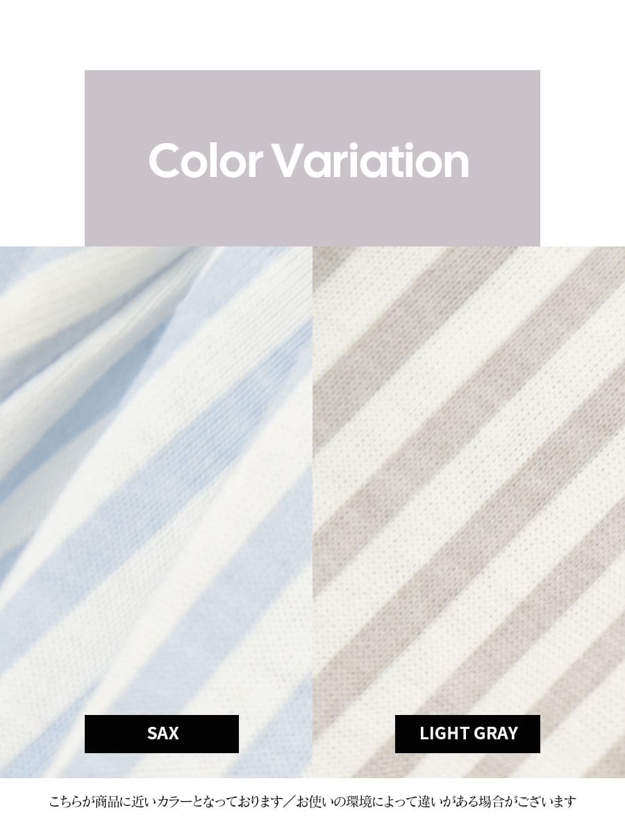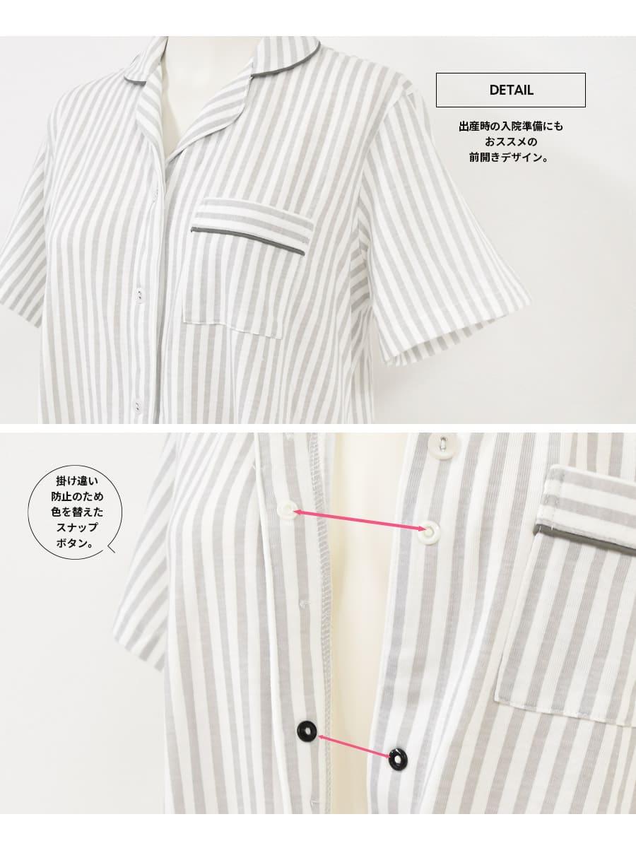 さわやかなカラーリングのストライプが大人モードなカットソーを使用した授乳用半袖パジャマです。