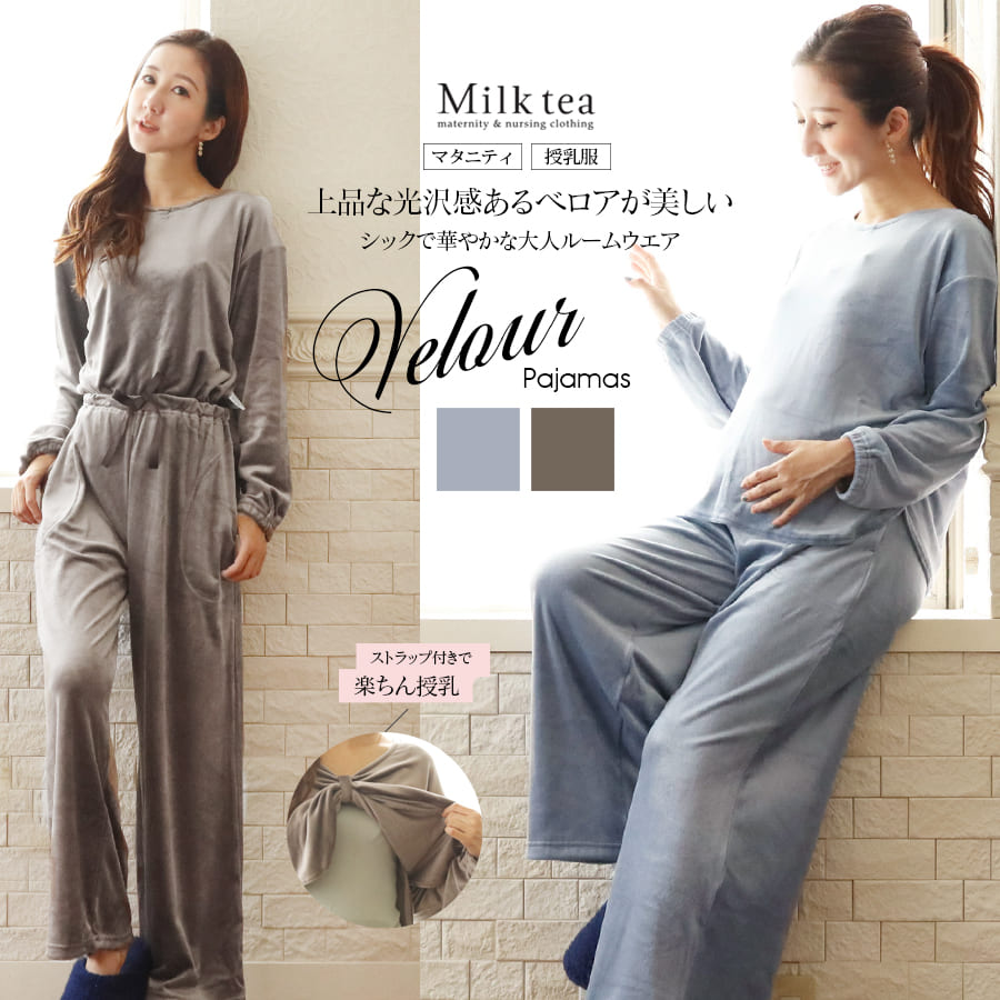 上品な光沢感のあるベロア素材でシックな華やかさを与えた、大人可愛い授乳口付きルームウェア。