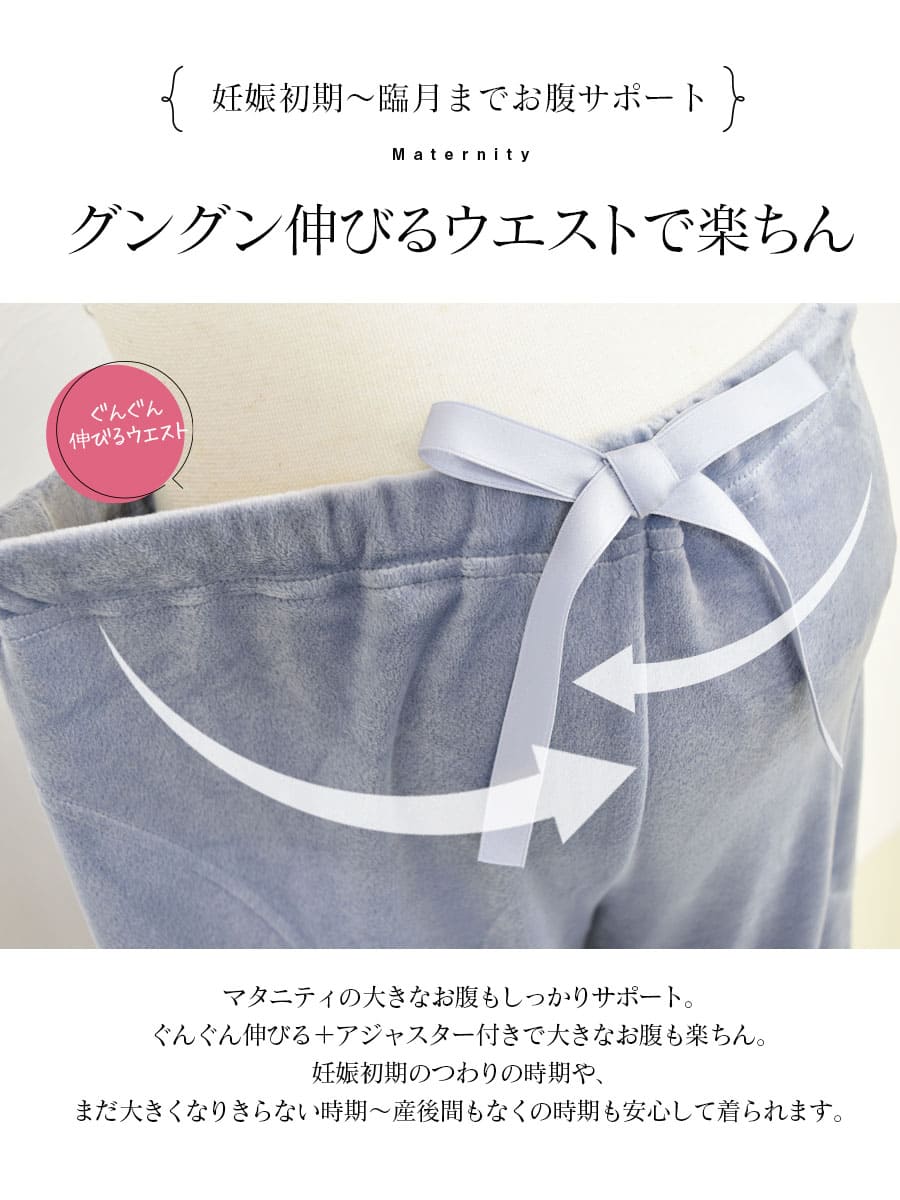 ゆったりワイドパンツはゴムアジャスター付きでお腹部分が調整できるので、妊娠初期〜産後の戻りきらないお腹にも優しい着心地で楽ちんです。