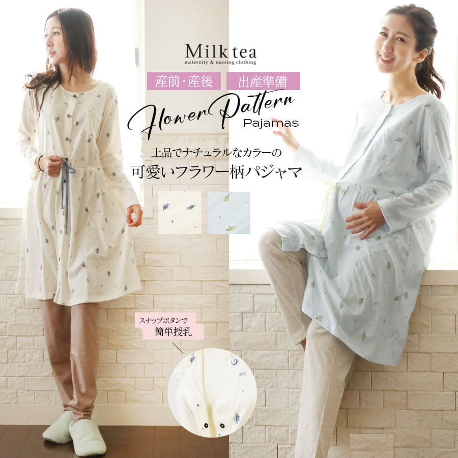 商品カテゴリ:授乳服 マタニティ 妊娠 出産 産前産後 マタニティウエア マタニティファッション 入院準備 出産準備 産院 パジャマ ママパジャマ 寝巻き 上下セット 2点セット 花柄 フラワー柄 綿 長袖 妊婦 妊婦服 マタニティー 春 夏 秋 冬 リラックス ルームウエア ママ ミルクティー ミルクティ Milk tea
