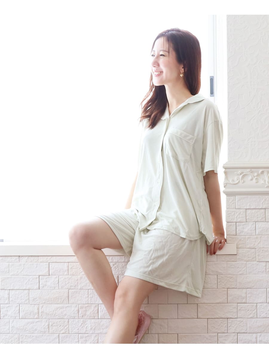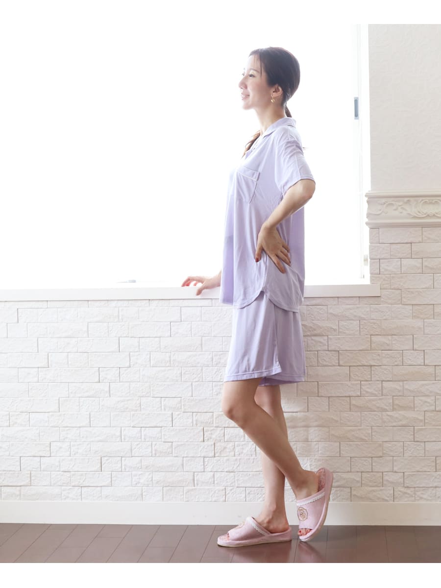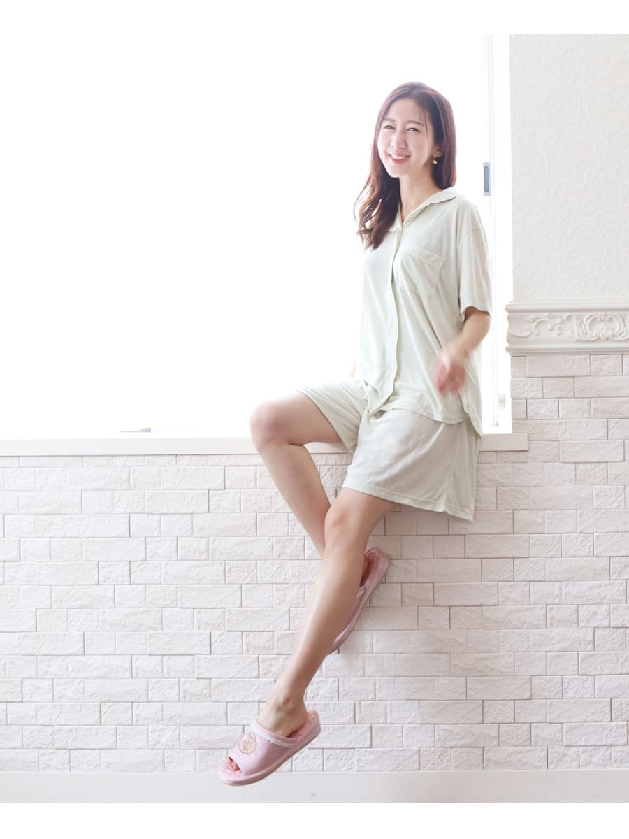 ・爽やかなカラーの動きやすいシ半袖トップスとショートパンツの組み合わせなので、涼やかでリラックス感満載。暑い時季におすすめです。