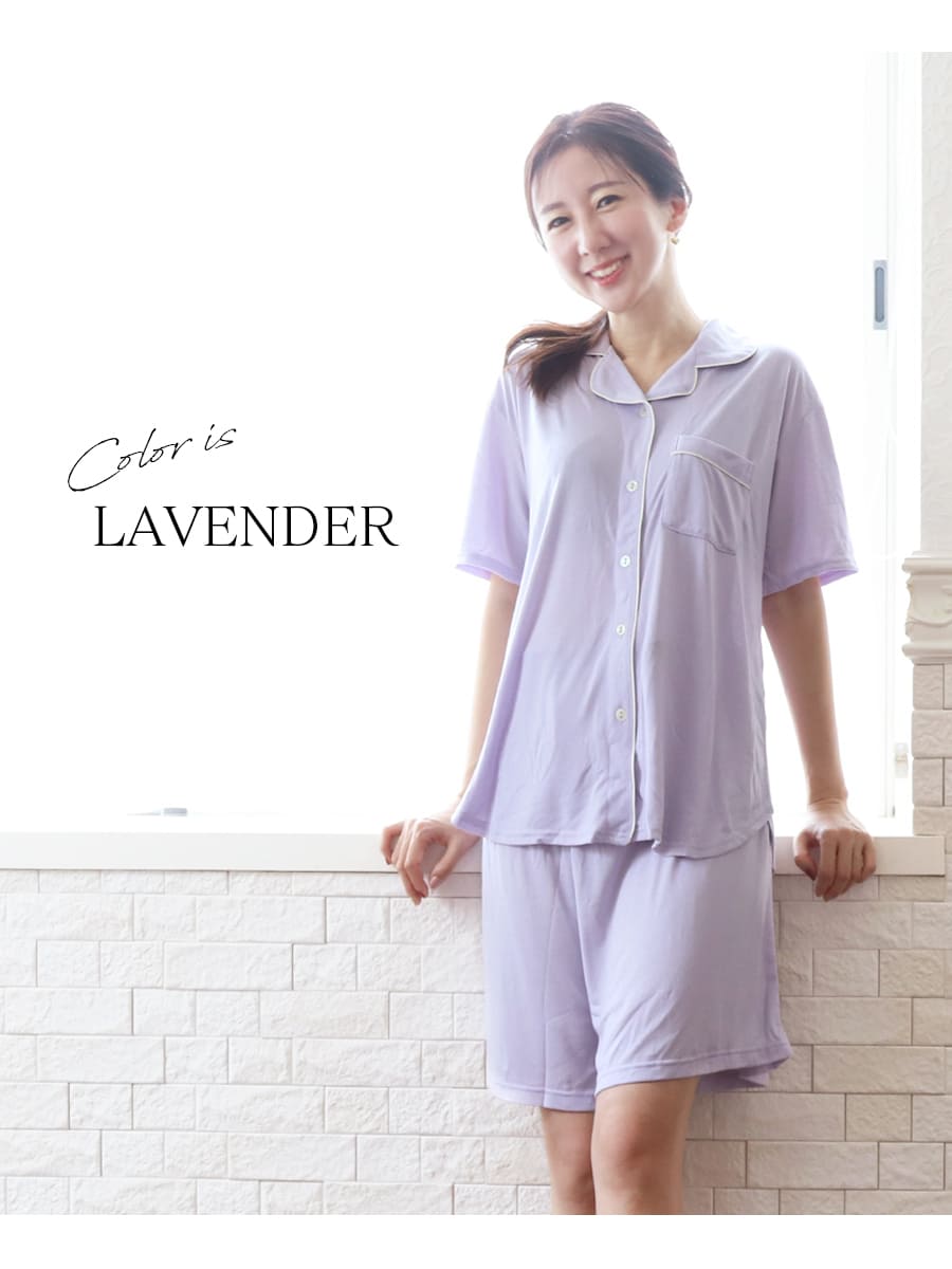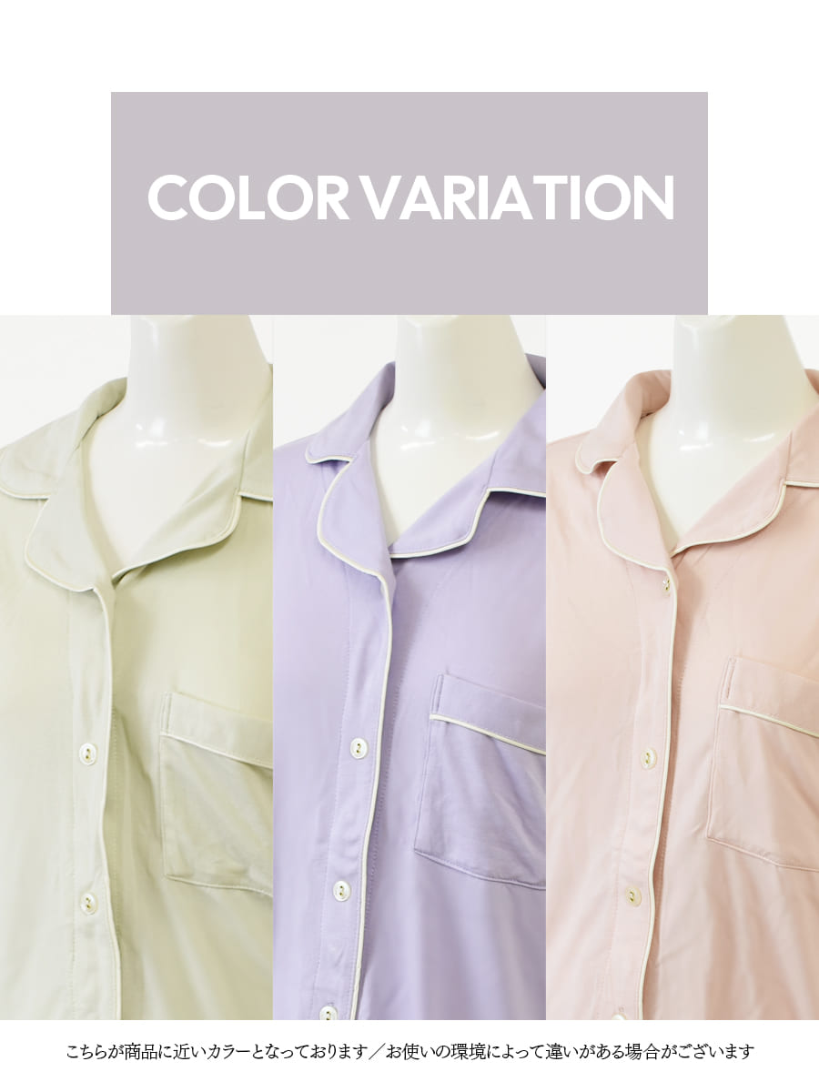 衿もとと胸ポケットの配色パイピングが上品でおしゃれなアクセントになった、やわらかなレーヨン素材が心地良いパジャマ上下セットです。